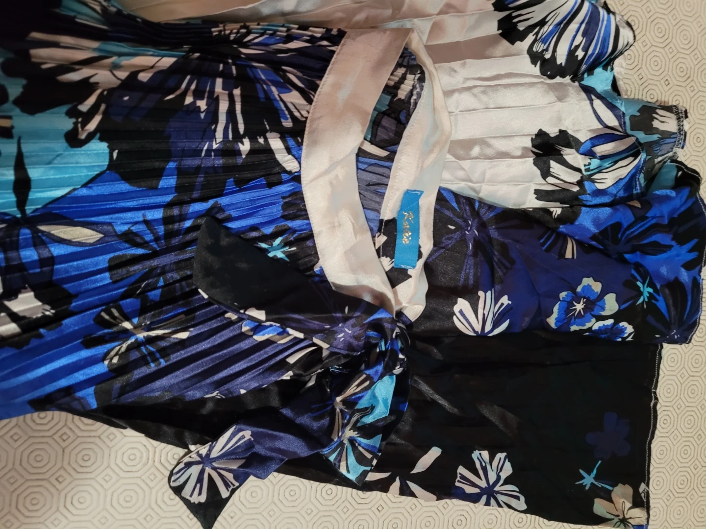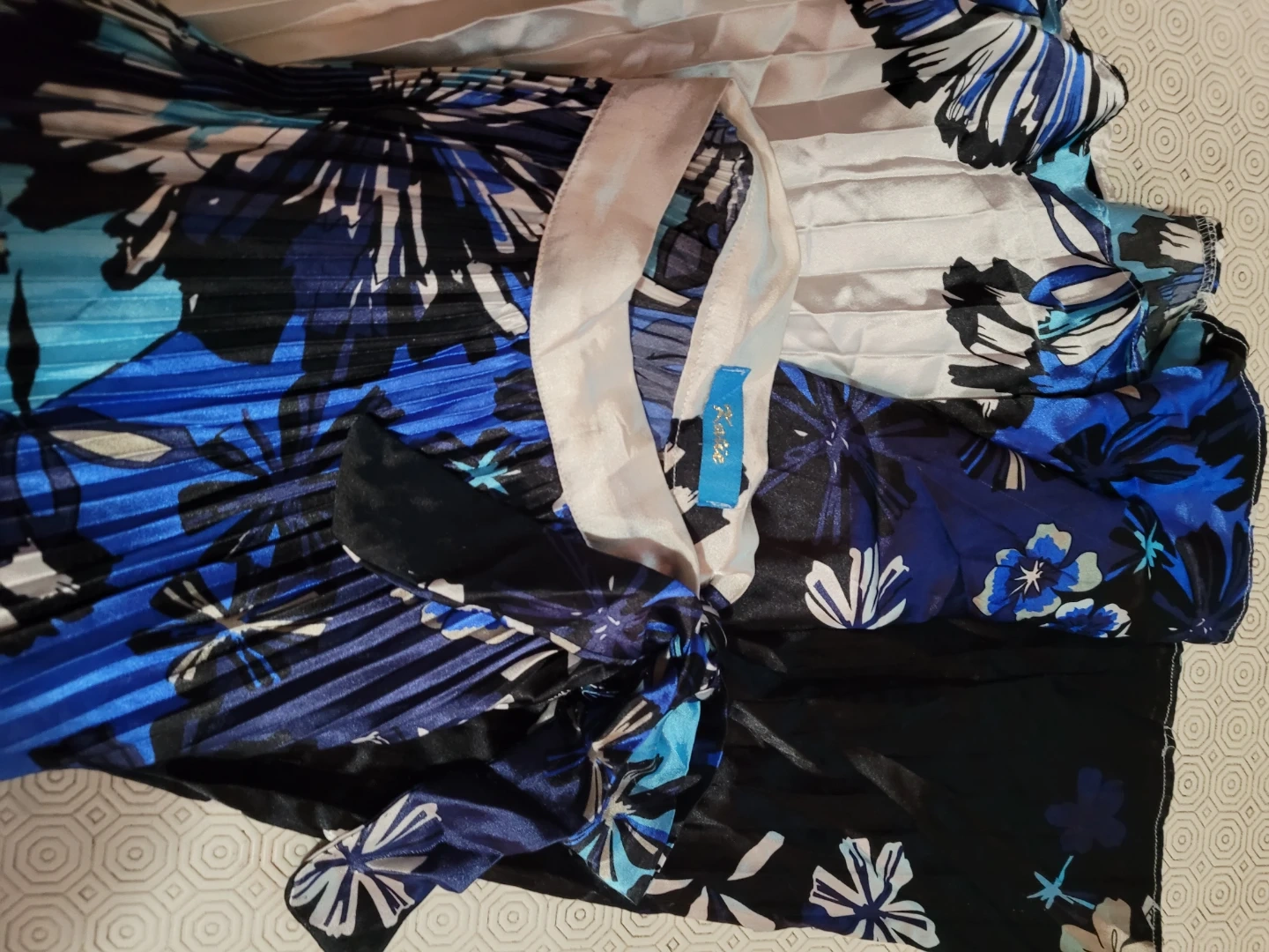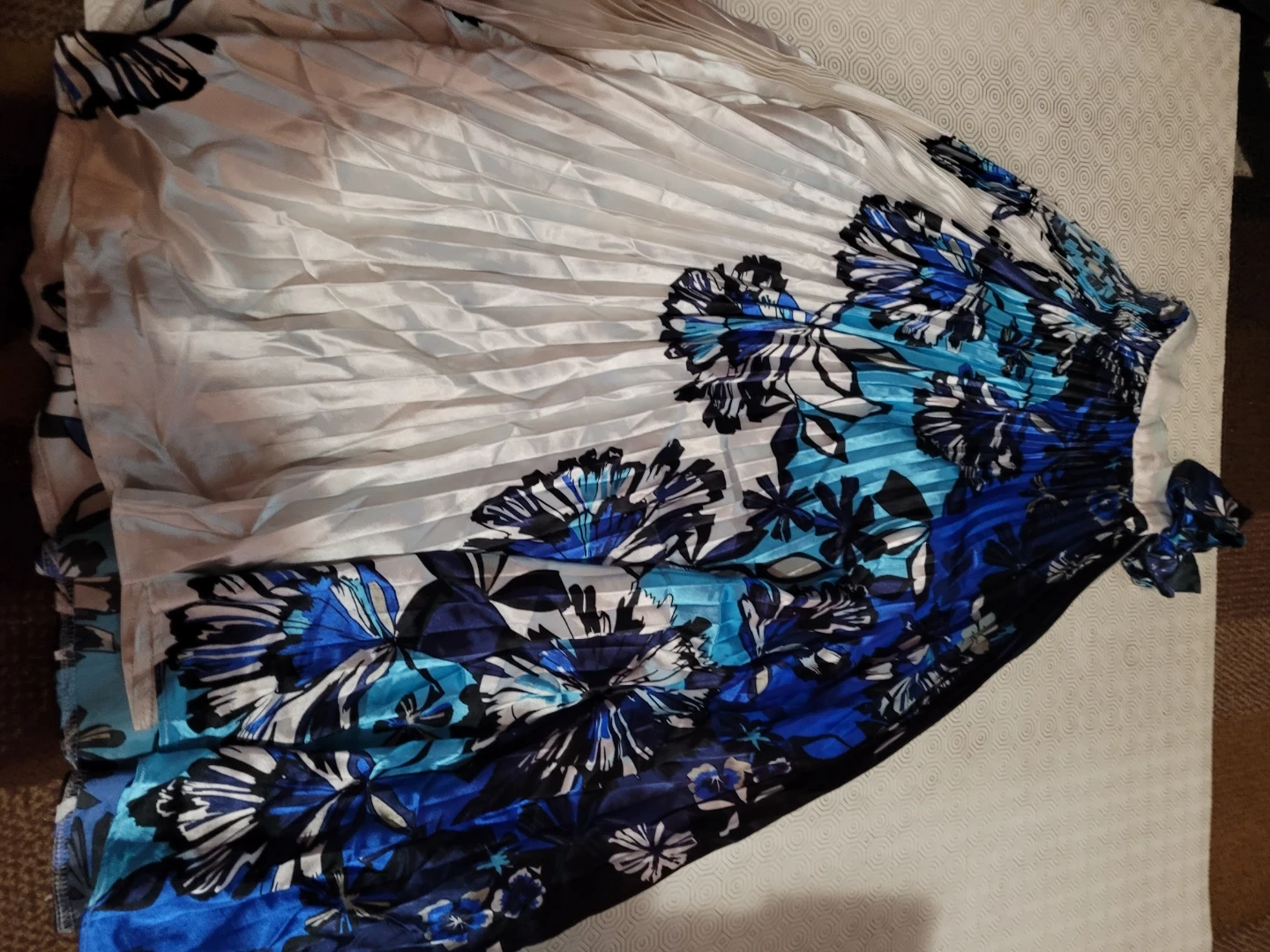 A flowy midi skirt with a vibrant blue floral print. It features a pleated design and a tie-waist detail for a custom fit. Silky material.