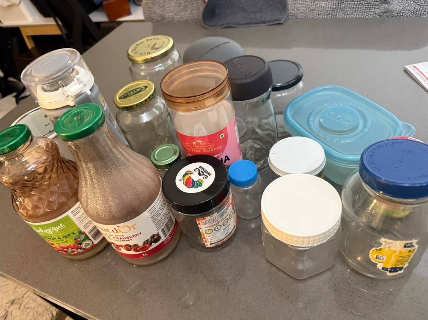 Assortment of various glass jars and plastic containers with lids. Includes a 1L 'Petit d'Or' Pure Juice Cranberry bottle and a 'biologique' bottle. Great for organizing or repurposing!