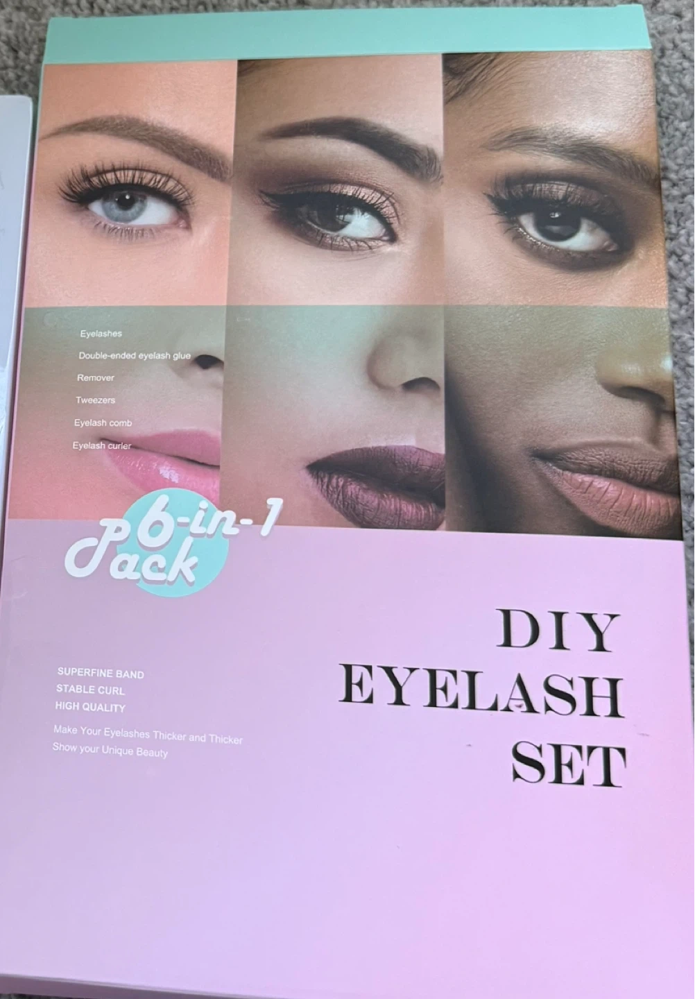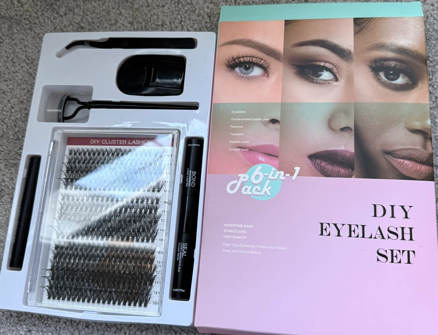 This is a 6-in-1 DIY Eyelash Set. It includes cluster lashes, glue, remover, tweezers, and an eyelash curler. The set also features a superfine band and stable curl for high quality results.