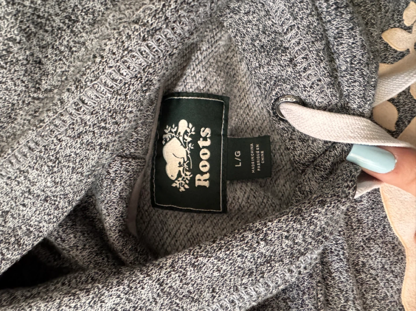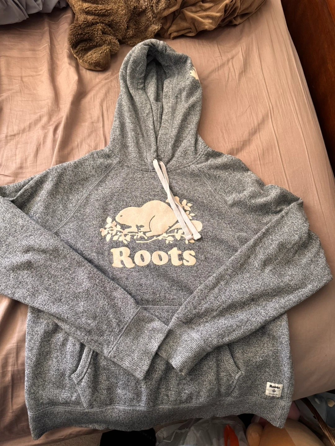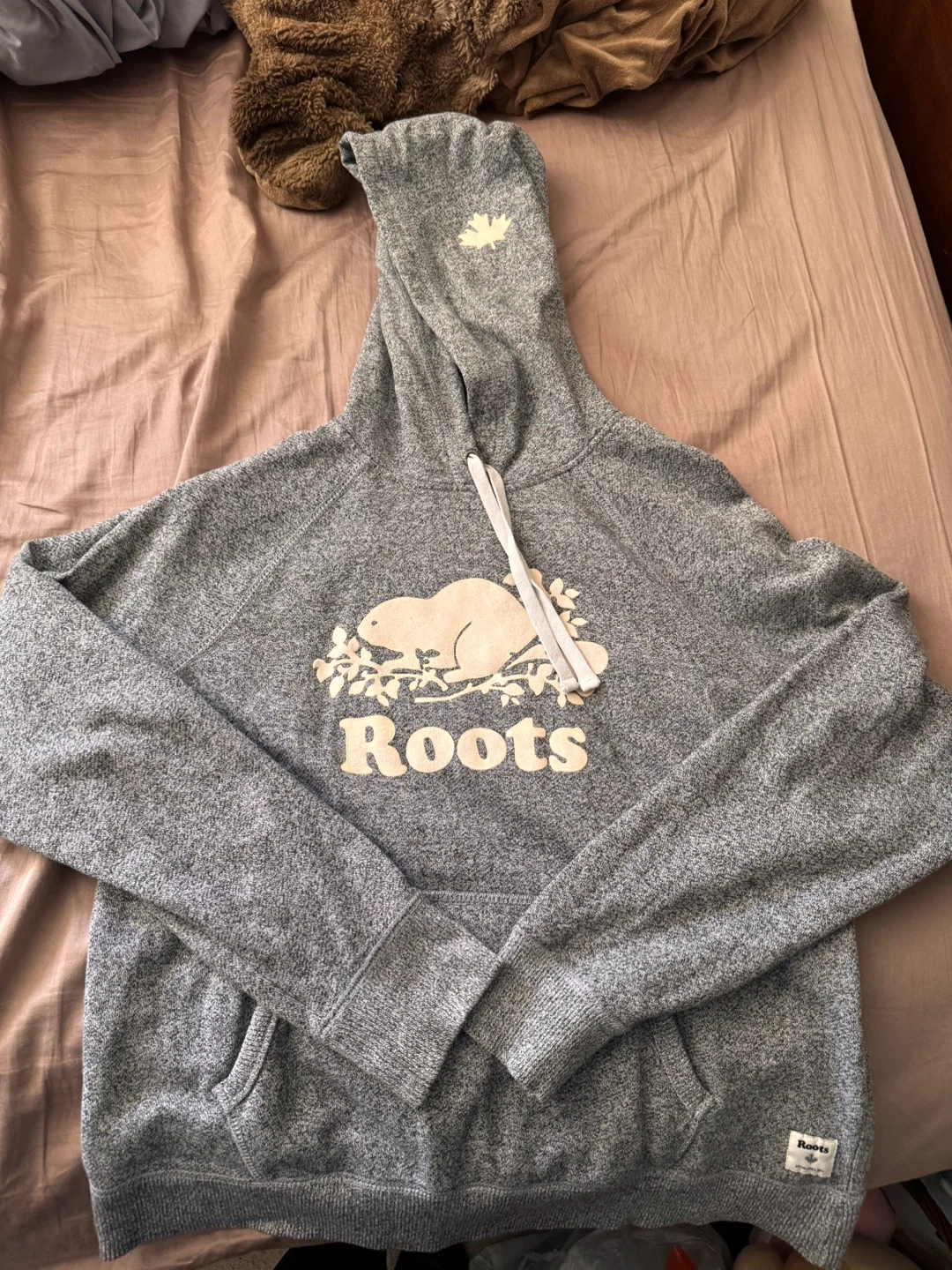 This Roots hoodie is a heather grey colour and features the iconic beaver logo. It's made from a comfortable fabric blend. Size is L/G. This hoodie is great for casual wear.