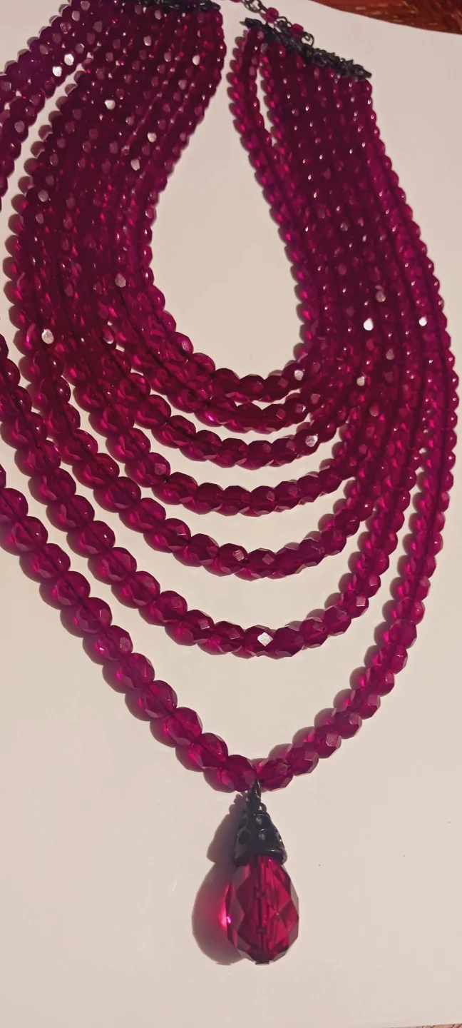 This is a gorgeous vintage unique multi-strand necklace featuring numerous faceted ruby beads. It includes a larger, teardrop-shaped pendant at the center. The necklace has a dark-toned clasp and a layered design. 20" long. Excellent condition. ALL MY PRICES ARE NEGOTIABLE !!