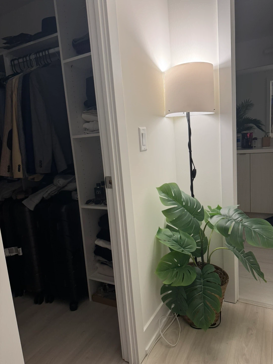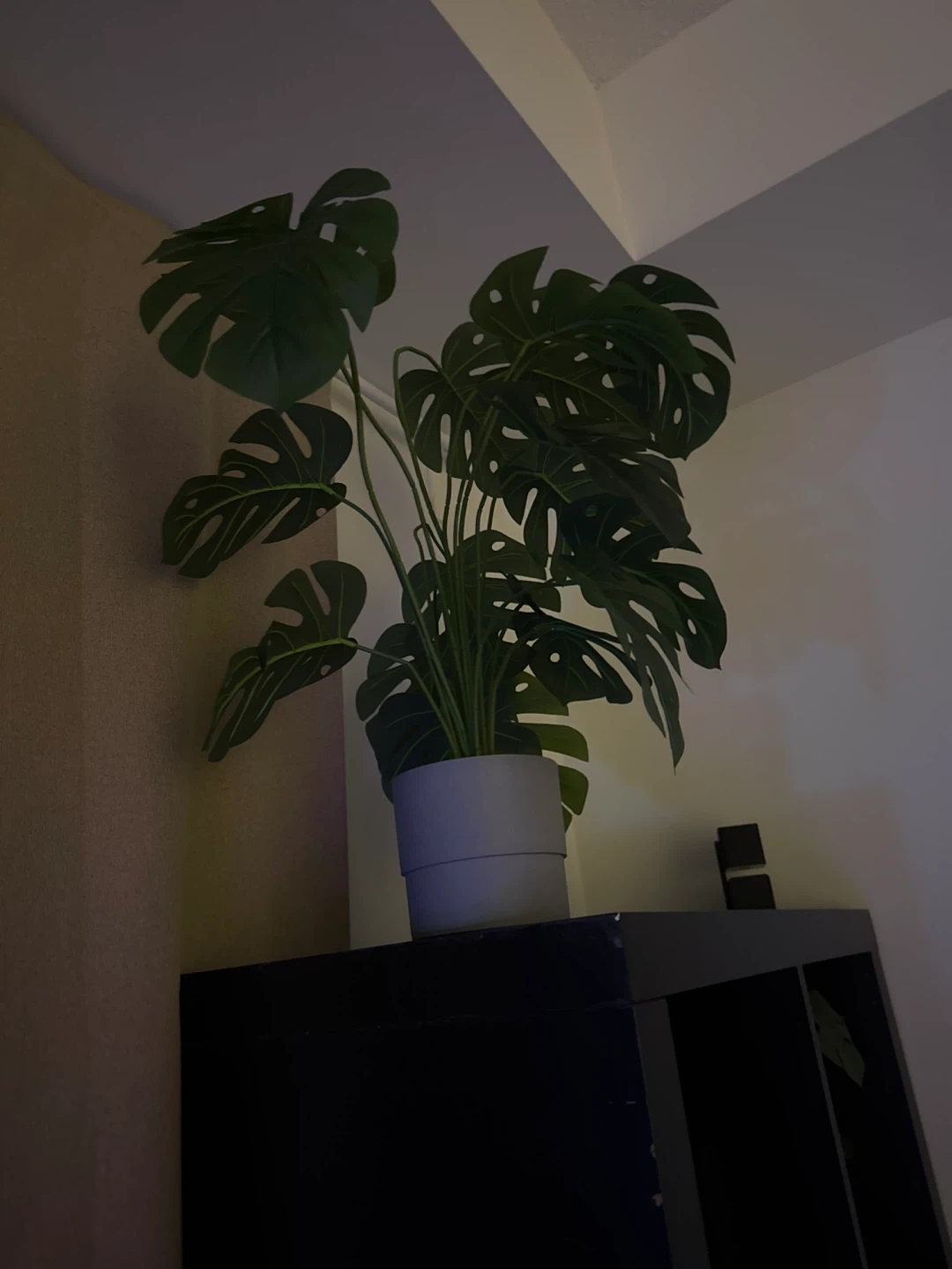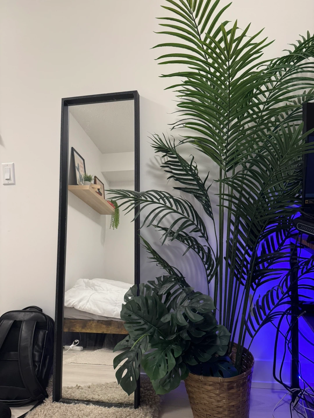 Two tall artificial Areca palm plant. And two small monstera plants It has realistic green fronds and comes in a white pot with a wooden stand. This plant adds a touch of greenery to any room.