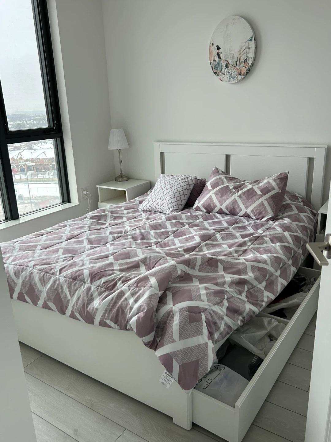 Clean white queen bed frame. Has 4 spacious storages underneath.