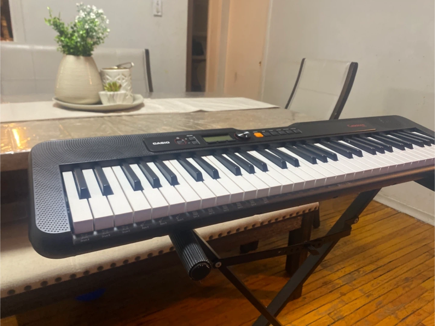 This is a Casio Casiotone keyboard with a black finish. It includes a keyboard stand for easy setup and playing. Perfect for beginners looking to learn piano.