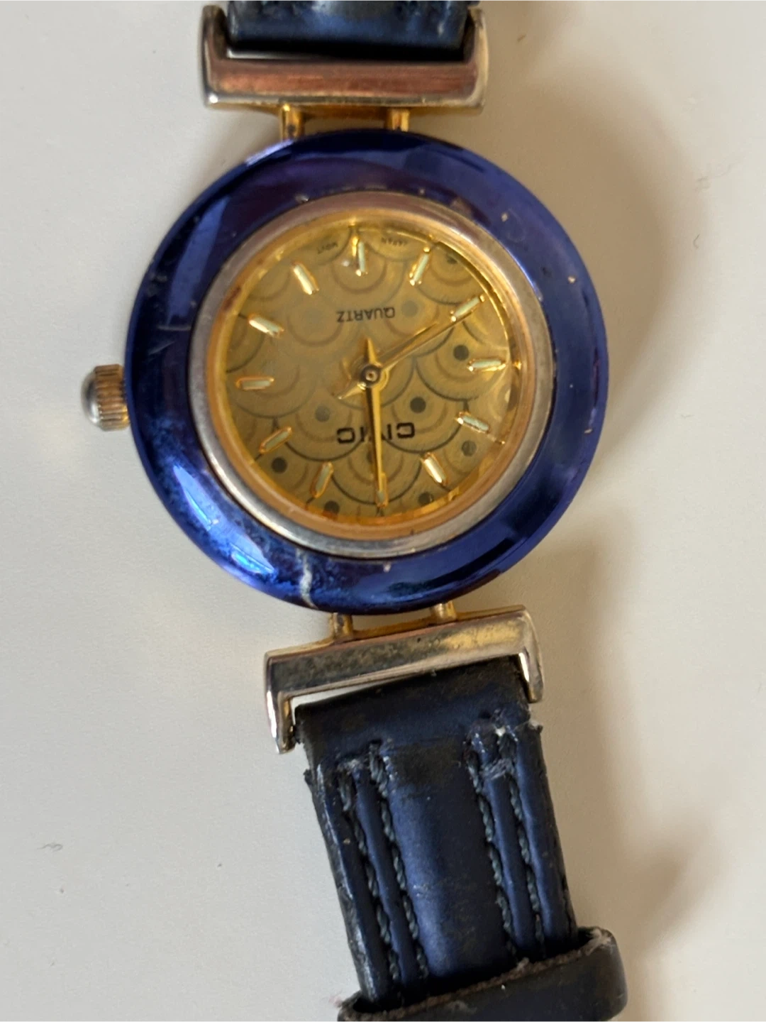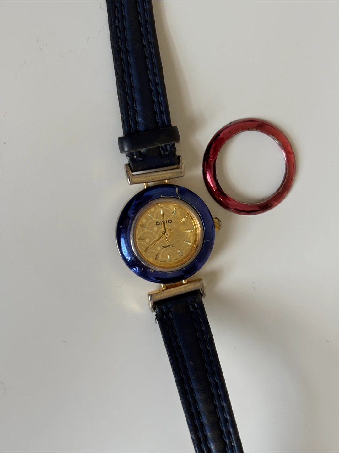 This CHIC quartz watch features a gold-tone dial and a blue bezel. It has a navy leather band and is water-resistant. A decorative red ring is also included.