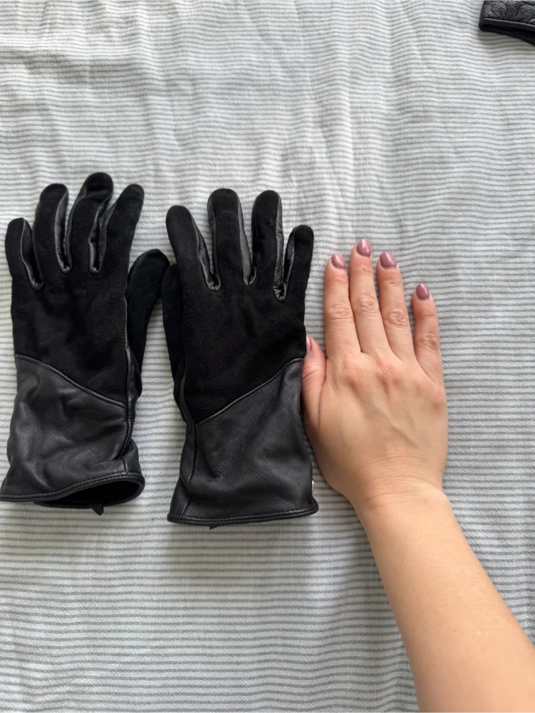 Black leather and suede gloves with a soft lining. Features a size S tag inside. Great for keeping your hands warm in the colder months!