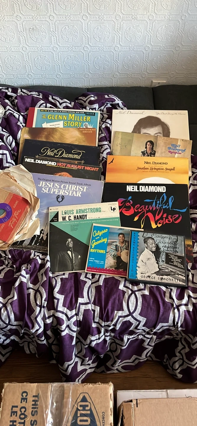 This is a collection of vintage vinyl records featuring a variety of artists including Neil Diamond, Louis Armstrong, and The Glenn Miller Story soundtrack. It also includes a Jesus Christ Superstar Original Motion Picture Sound Track album. Records come in sleeves and some are in their original jackets.