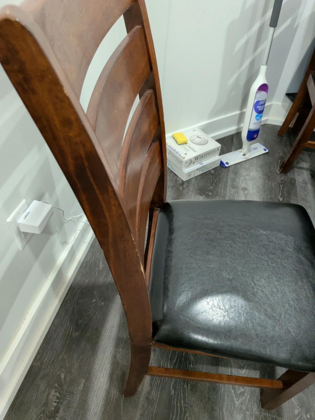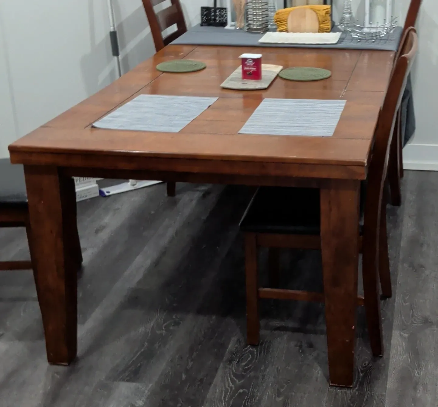 Solid wood dining table with a rich brown finish. It seats six people comfortably. This table is great for family dinners and entertaining guests.
