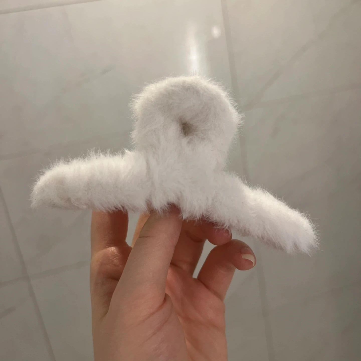 A cute white fuzzy claw clip for your hair. It's made of a soft material and has a secure grip.