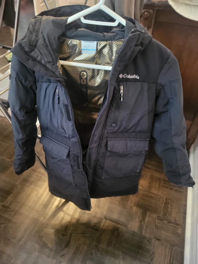 Columbia black winter jacket for kids. It's insulated and features a hood for extra warmth. Perfect for staying cozy during colder months! One size small and one size medium