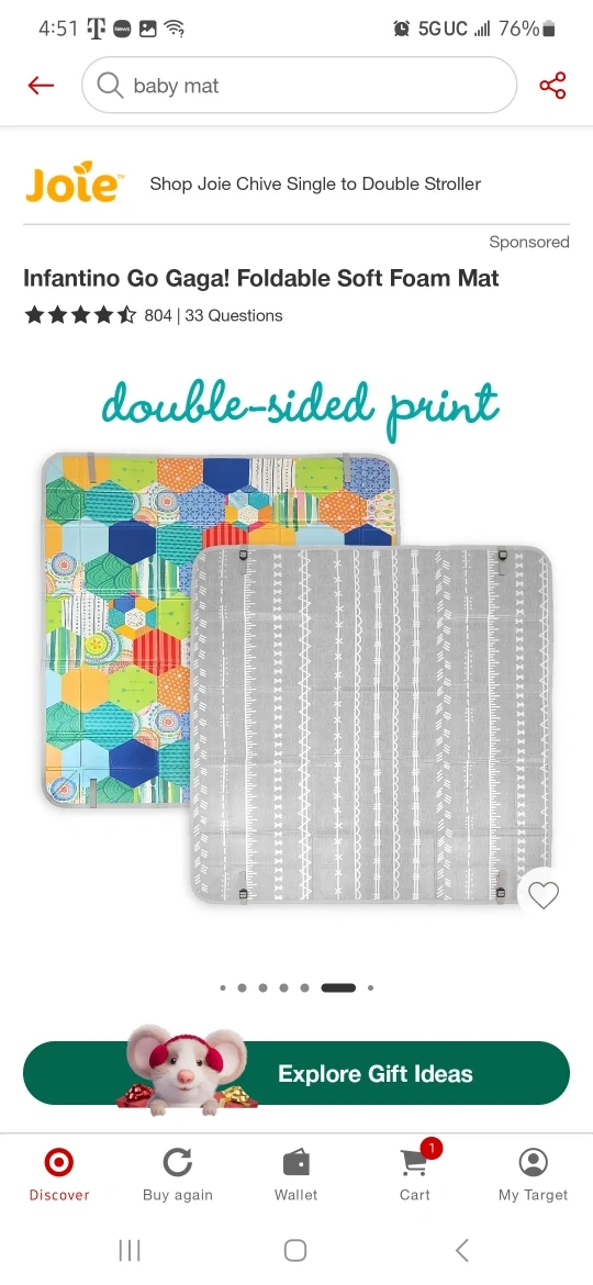 Foldable Soft Foam Mat. It features a double-sided print and a compact, light fold & go design. It also includes a vinyl storage bag! When opened flat, it measures 57.8" x 57.8" (1468 mm x 1468 mm). It's easy to wipe clean and has a reversible design. has 1 small tear on the colorful side but still can be used.