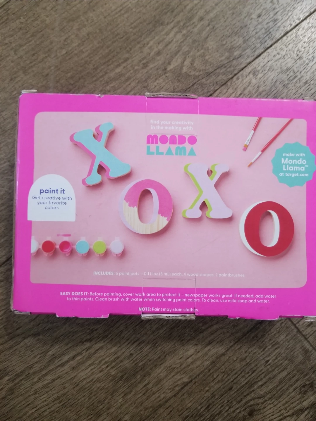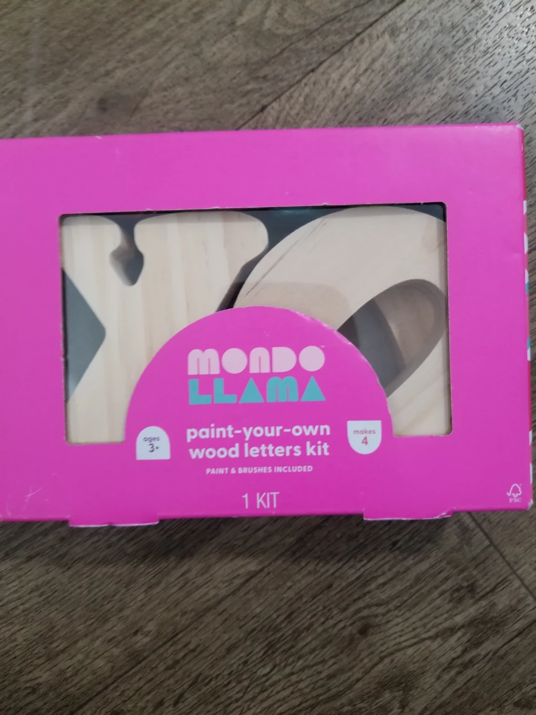 This Mondo Llama kit lets you paint your own wood letters. It includes 6 paint pots, 4 wood shapes, and 2 paintbrushes. It's great for ages 3 and up! Brand new in package