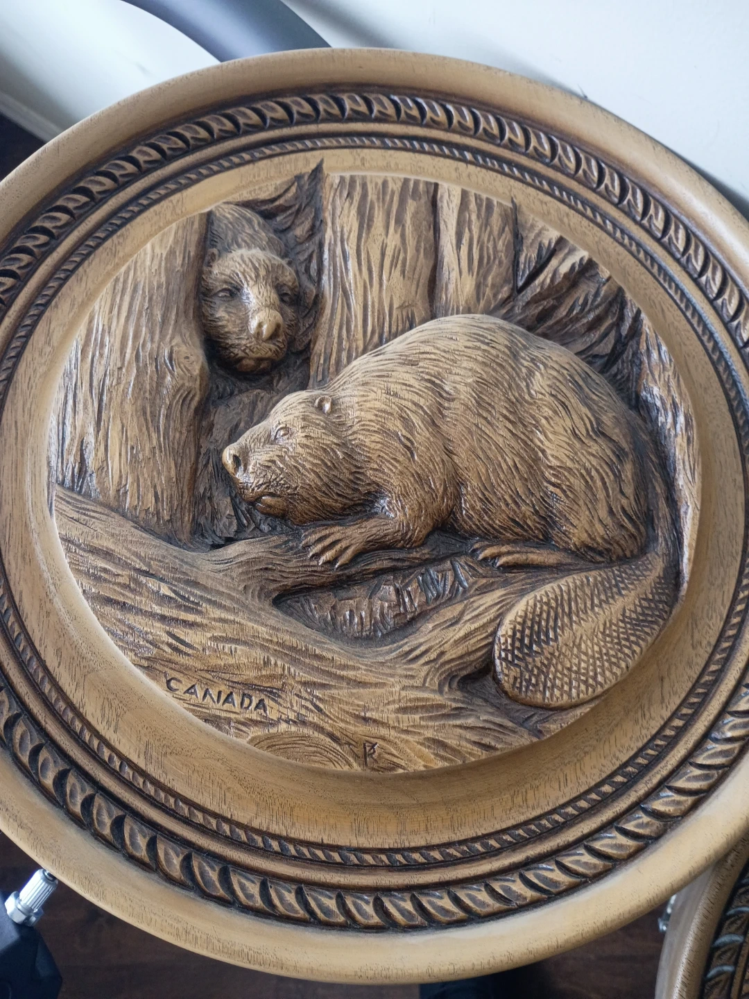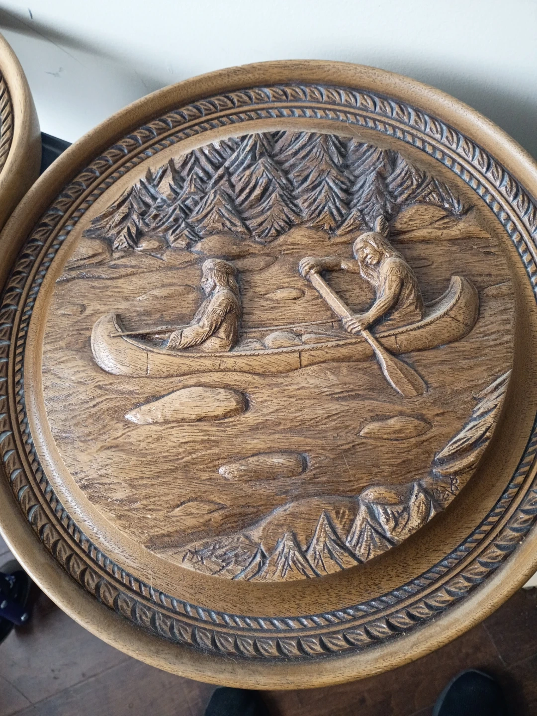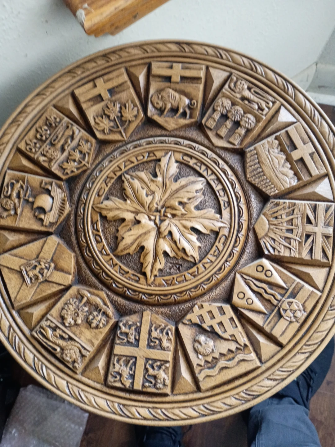 This is a carved wooden plaque depicting scenes from Canadian life. It features imagery of dog sledding in Yellowknife, Northwest Territories, a canoe scene, and a beaver. There's also a central maple leaf surrounded by various crests. It's a nice piece of Canadian art. This plaque would make a thoughtful gift for anyone who loves Canadian heritage. Pick up only take them all $50