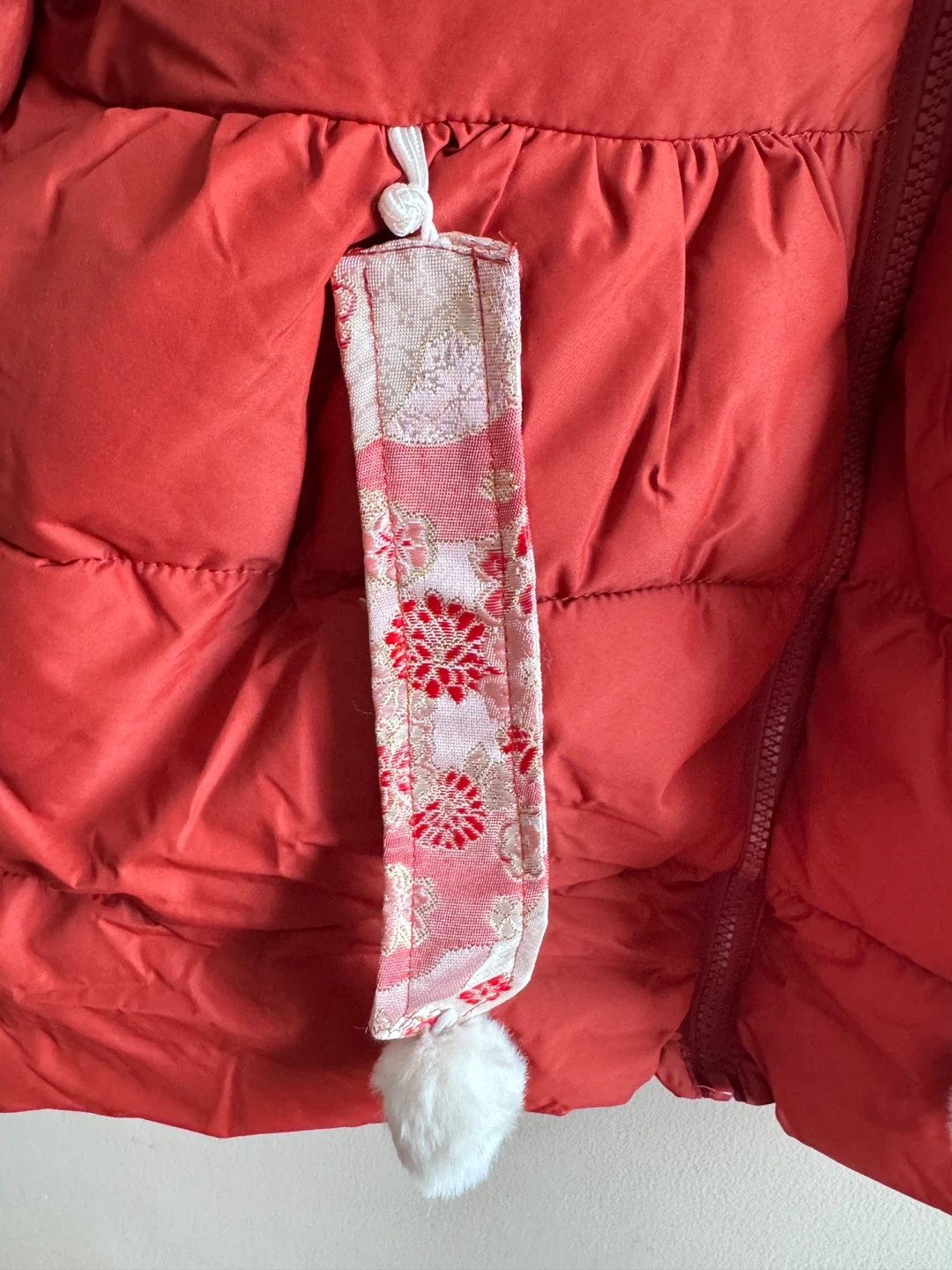 Keep your little one warm this winter with this adorable red padded coat! It features a unique floral collar with soft, fluffy trim, adding a touch of charm to the classic puffer style. The coat is in great condition and ready for a new home.