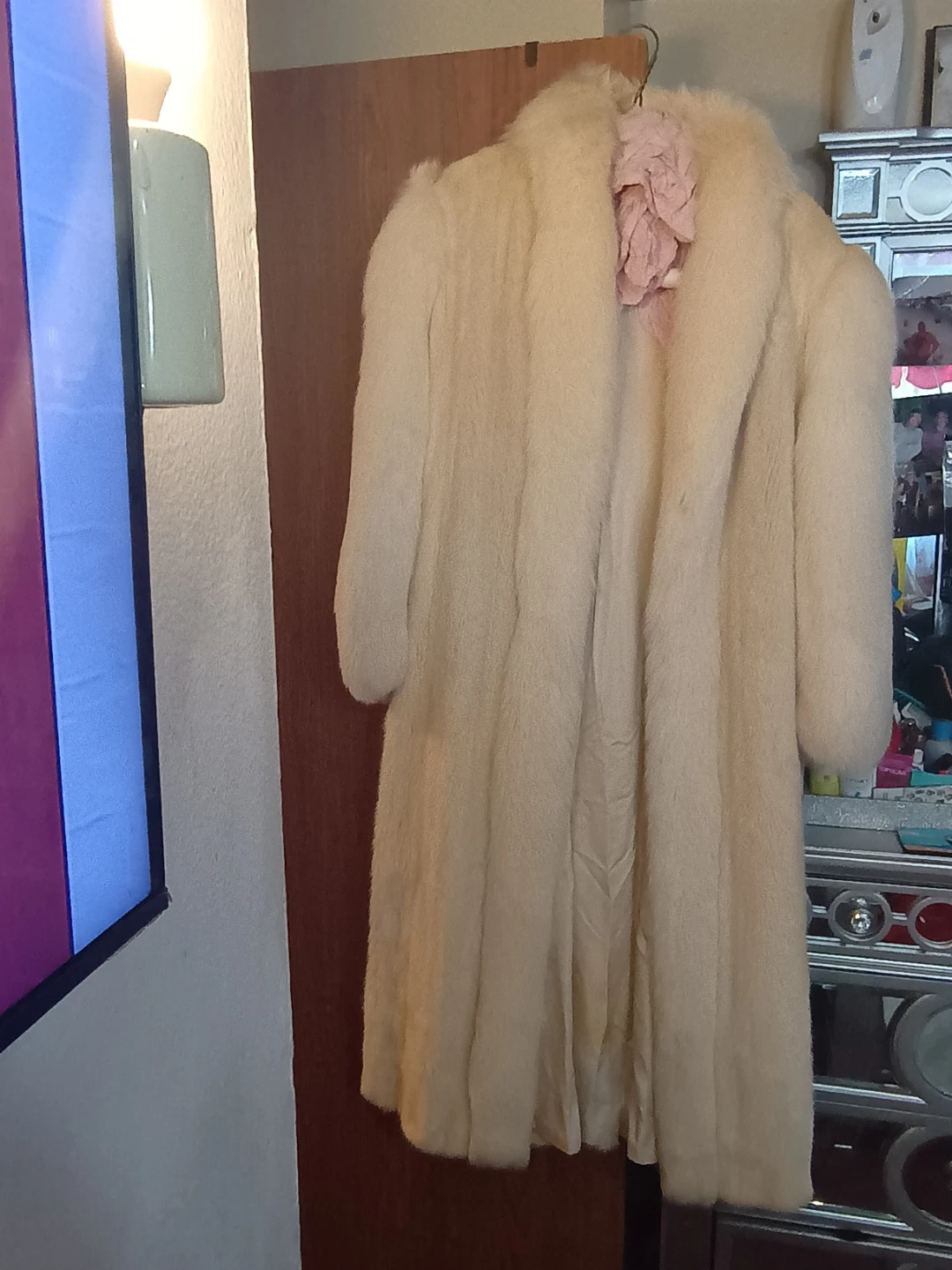 Selling a vintage mink/fox fur coat. It's a beautiful piece in a cream or off-white color. Perfect for adding a touch of elegance to your wardrobe