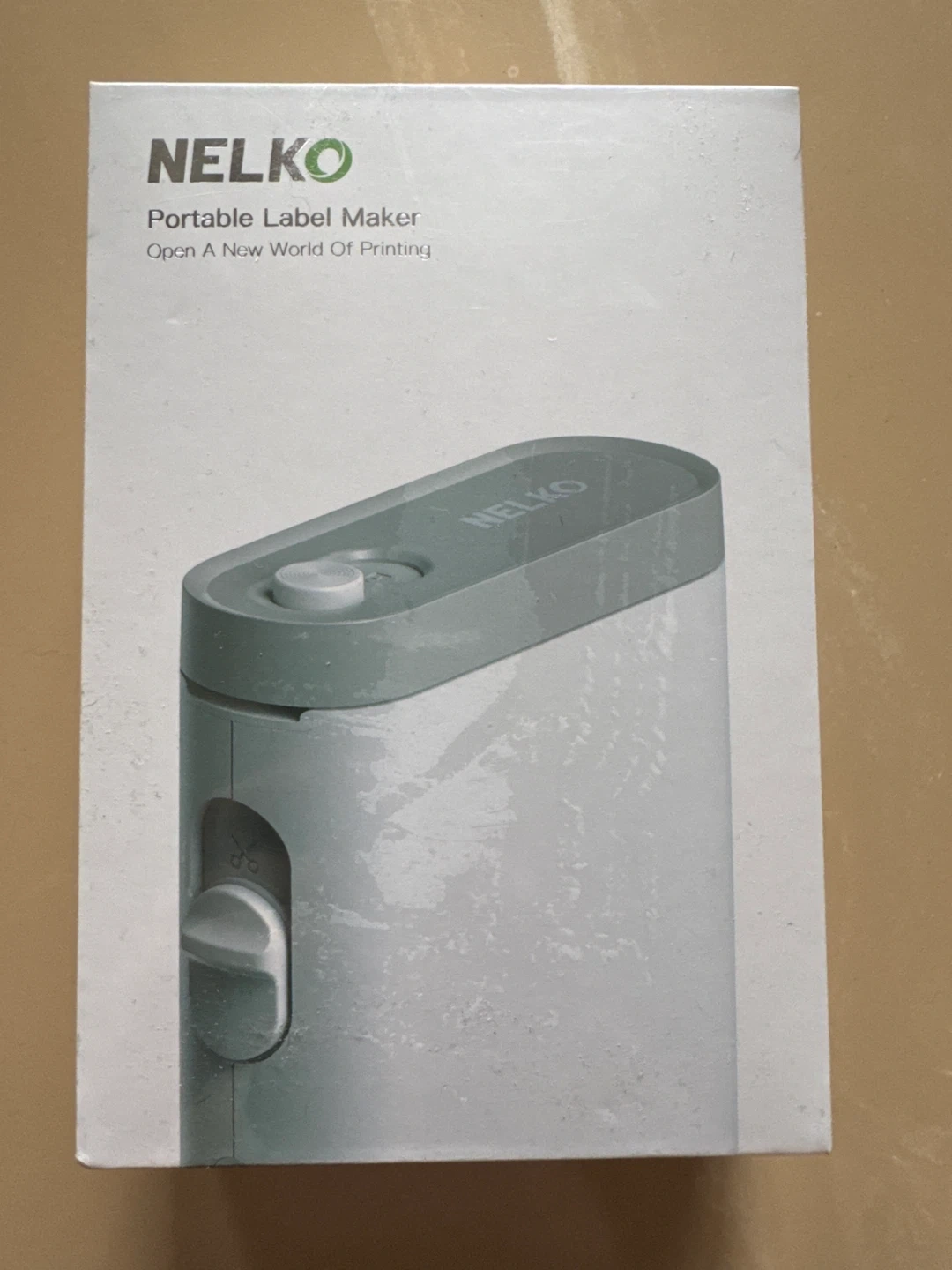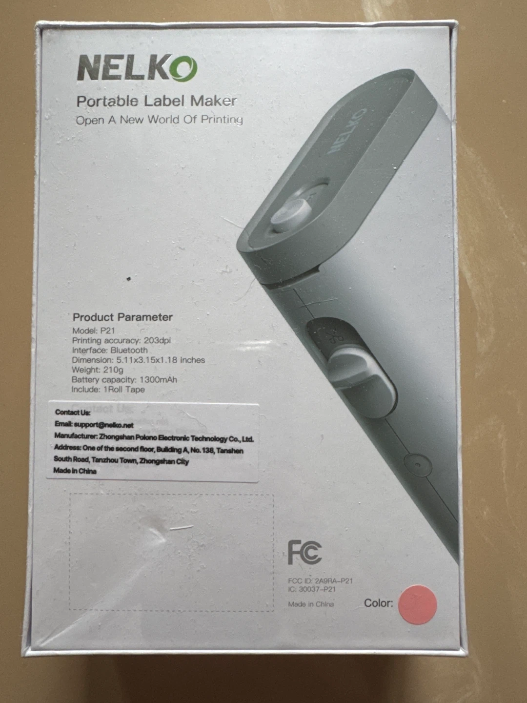 NELKO portable label maker, model P21. It has Bluetooth interface and 203dpi printing accuracy. Battery capacity is 1300mAh and it includes roll tape. This label maker is useful for organizing items at home or in the office.