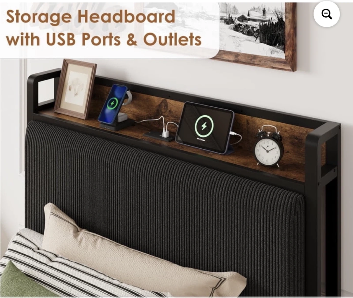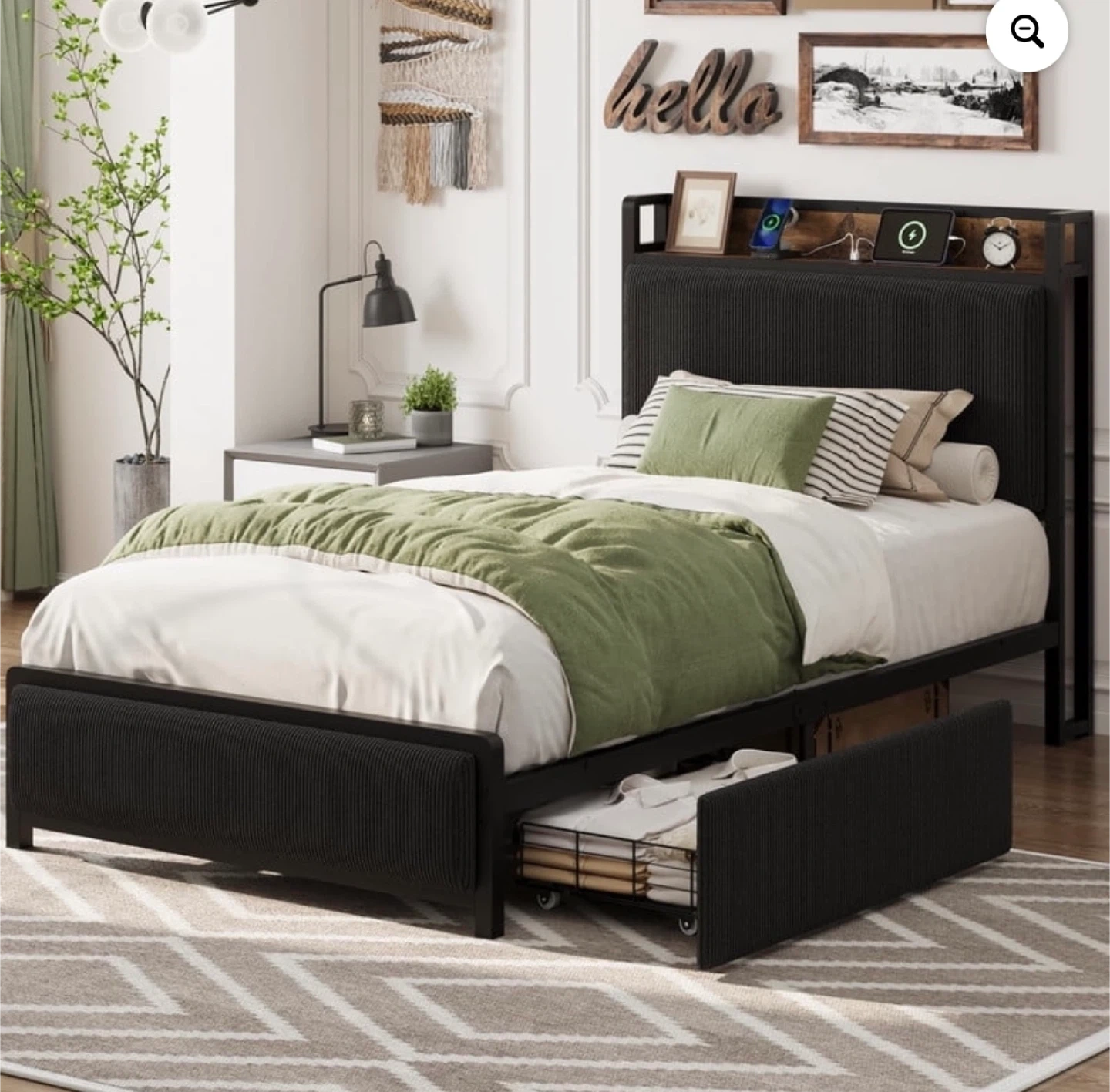 This twin size bed frame and Mattress features a storage headboard with built-in USB ports and power outlets for convenient charging. It's constructed with a sturdy metal frame and includes two drawers for extra storage. The upholstered headboard adds a touch of comfort.pick up Only