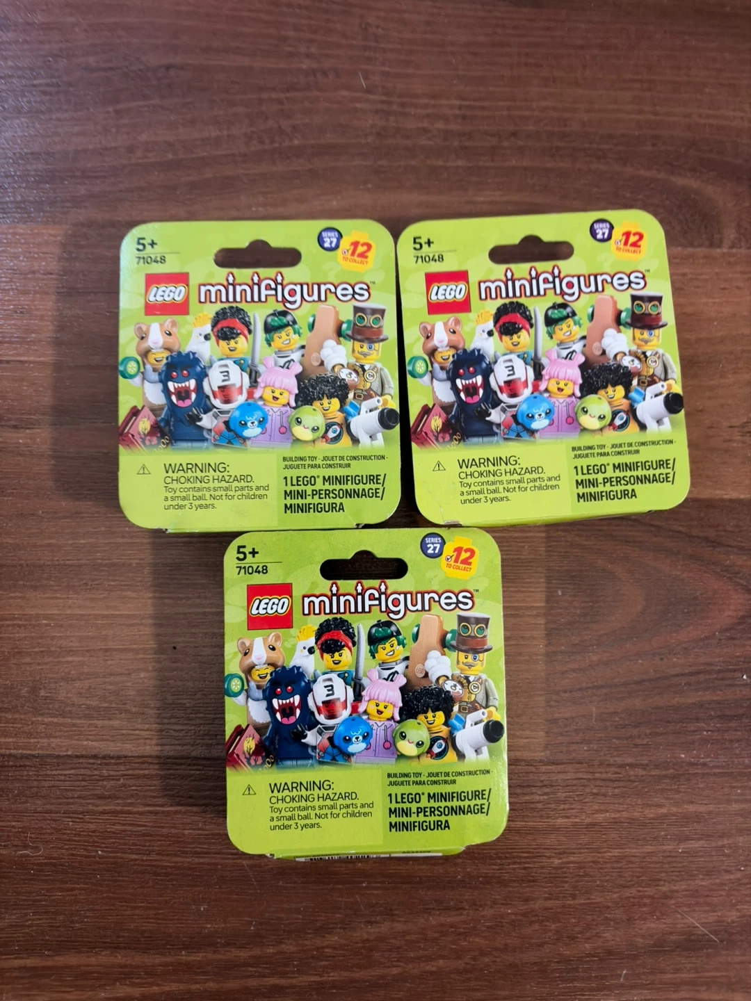 Three sealed LEGO Minifigures Series 27 blind bags. Each bag contains one collectible minifigure. Collectible toy for ages 5 and up.