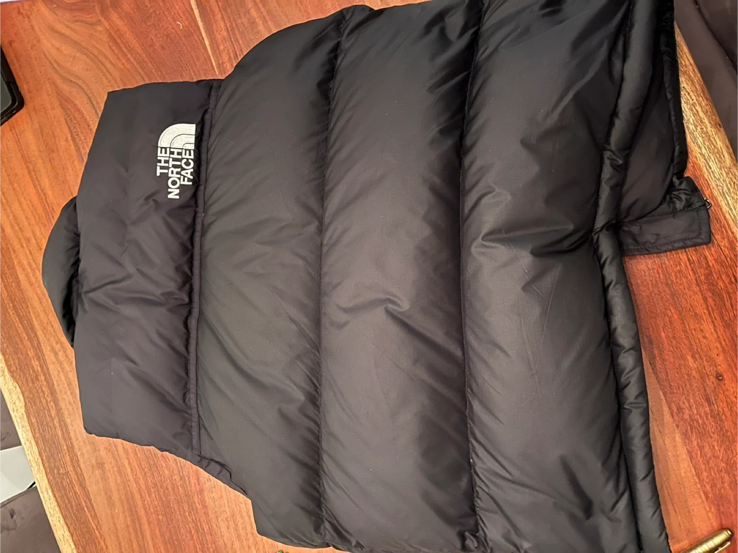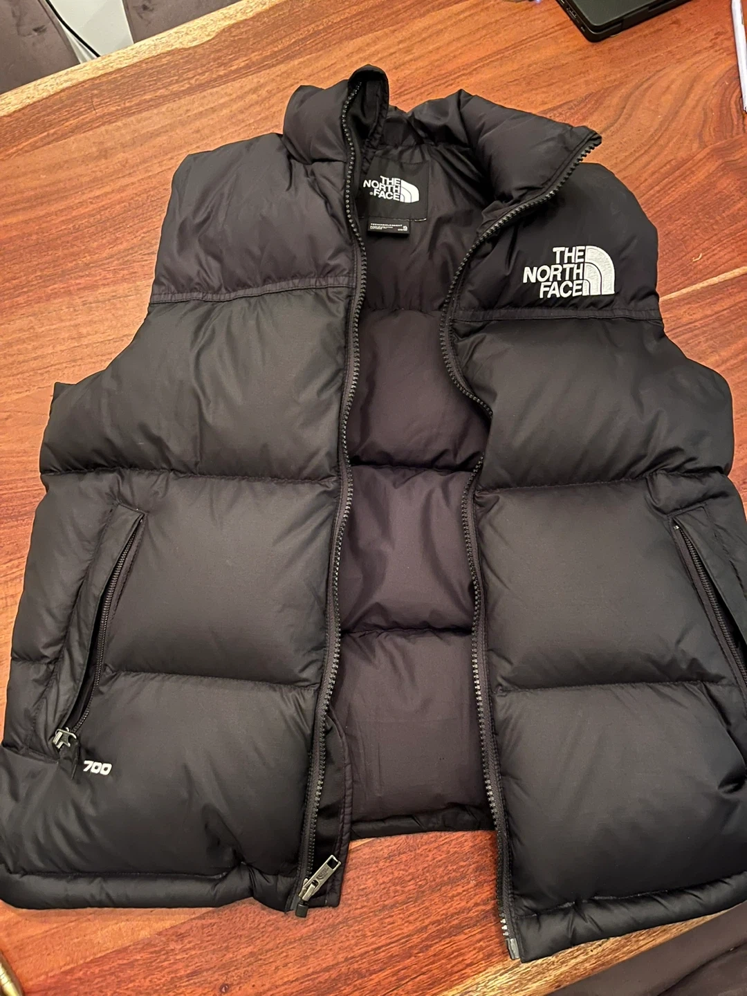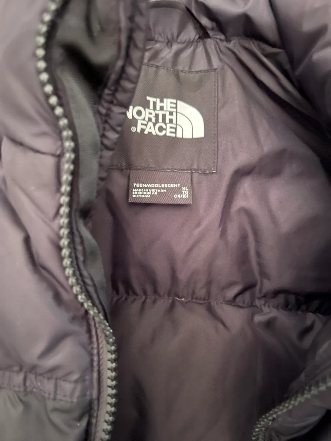 Black puffer vest from The North Face, featuring 700 fill down. It's a teen/adolescent size XL, which corresponds to a (14/16). Made in Vietnam.