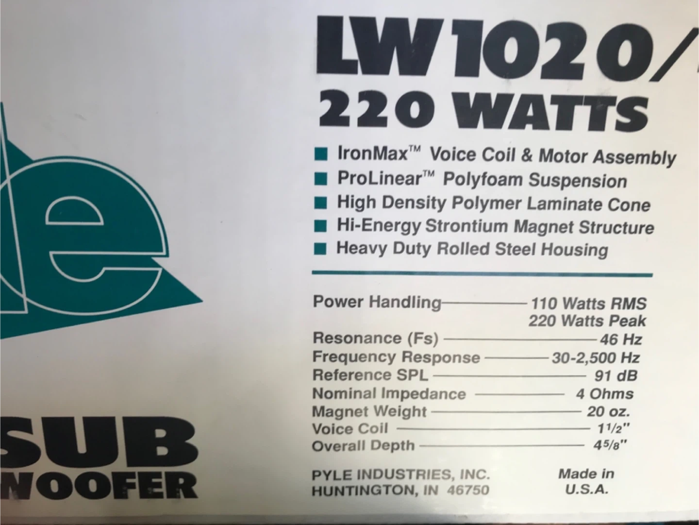 Selling a Pyle LW1020 10" subwoofer, rated at 220 Watts peak power. Key features include: - IronMax Voice Coil & Motor Assembly - ProLinear Polyfoam Suspension - High Density Polymer Laminate Cone - Hi-Energy Strontium Magnet Structure - Heavy Duty Rolled Steel Housing Nominal Impedance: 4 Ohms