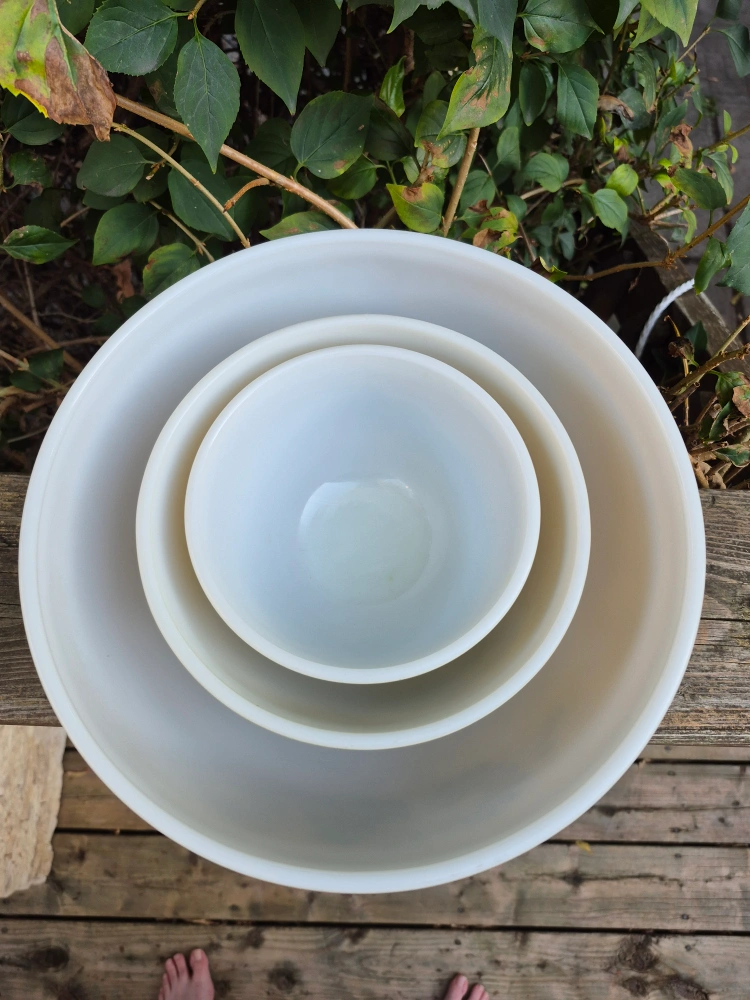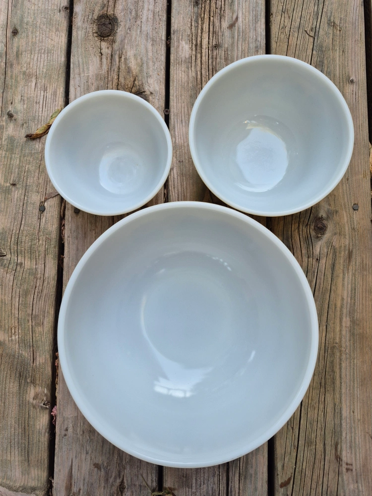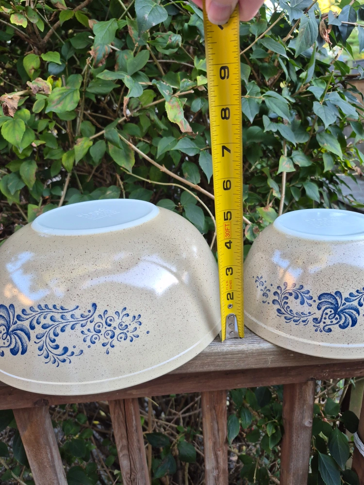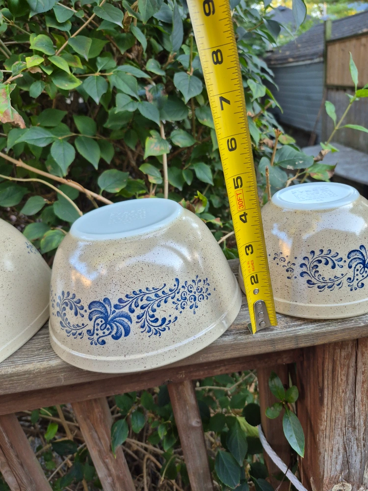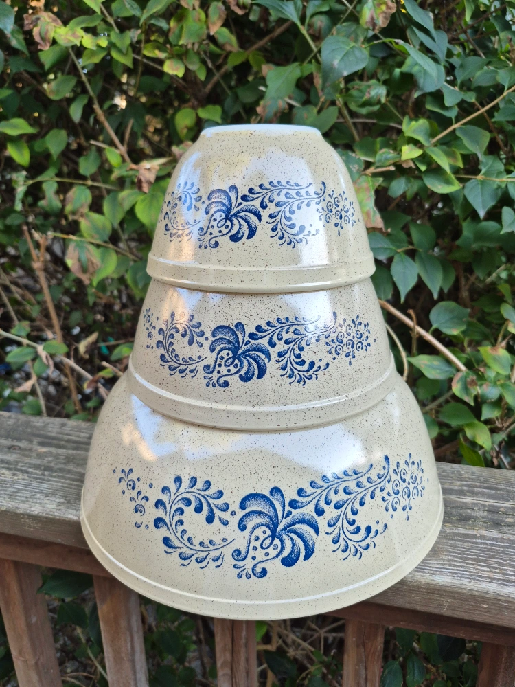 Selling a vintage Homestead Pyrex mixing bowl set. This set includes three bowls in graduated sizes. They're perfect for baking, cooking, or serving. The bowls are in good condition and ready for a new home! Pick up only no meet-up. Main and Danforth East York Woodbine/ Lumsden Cash only