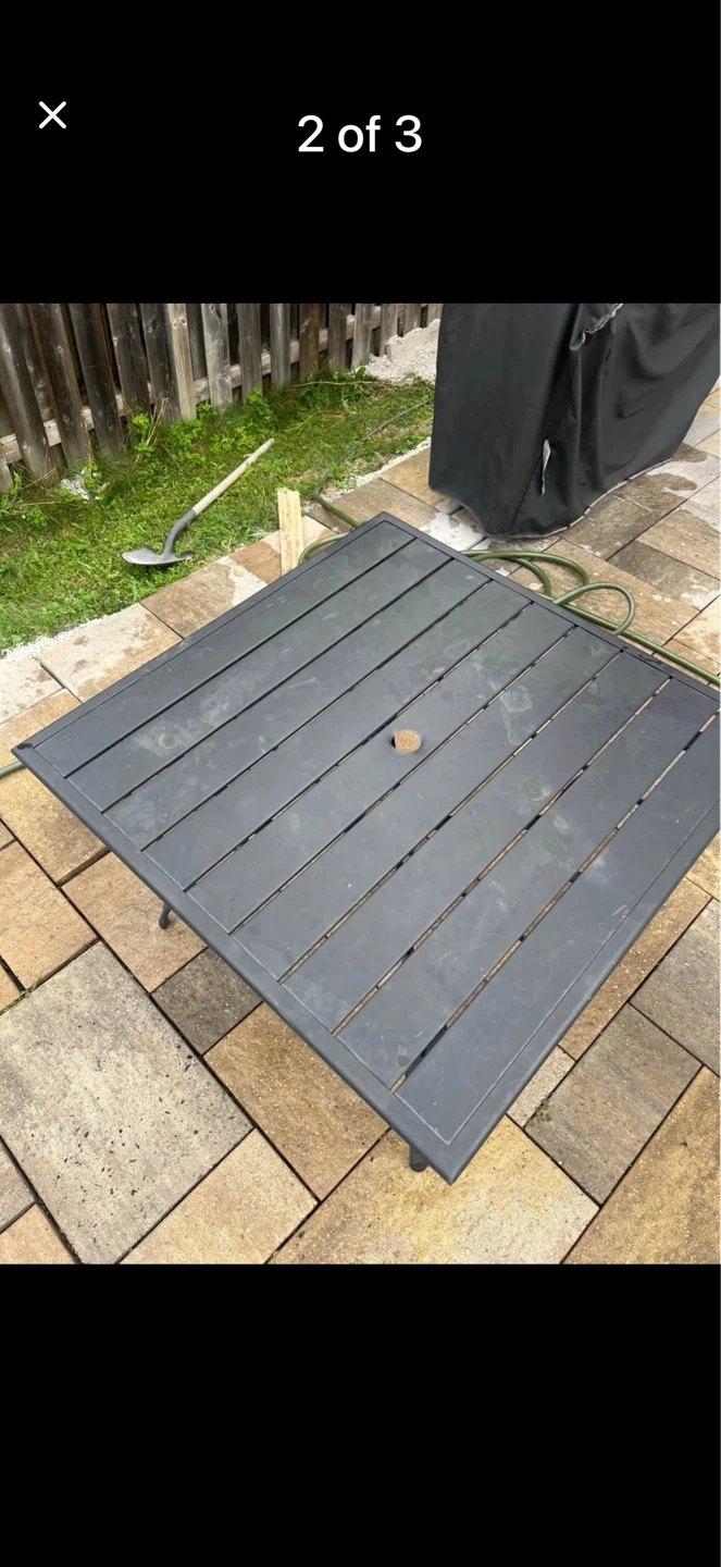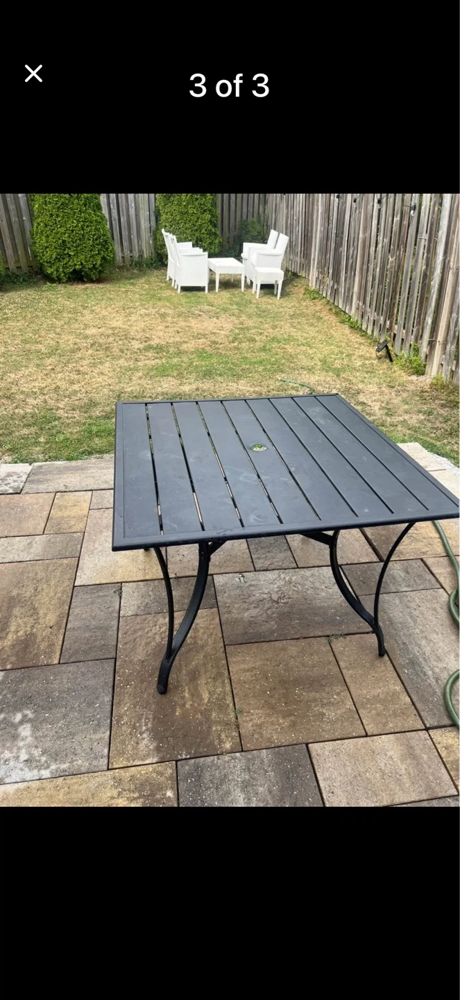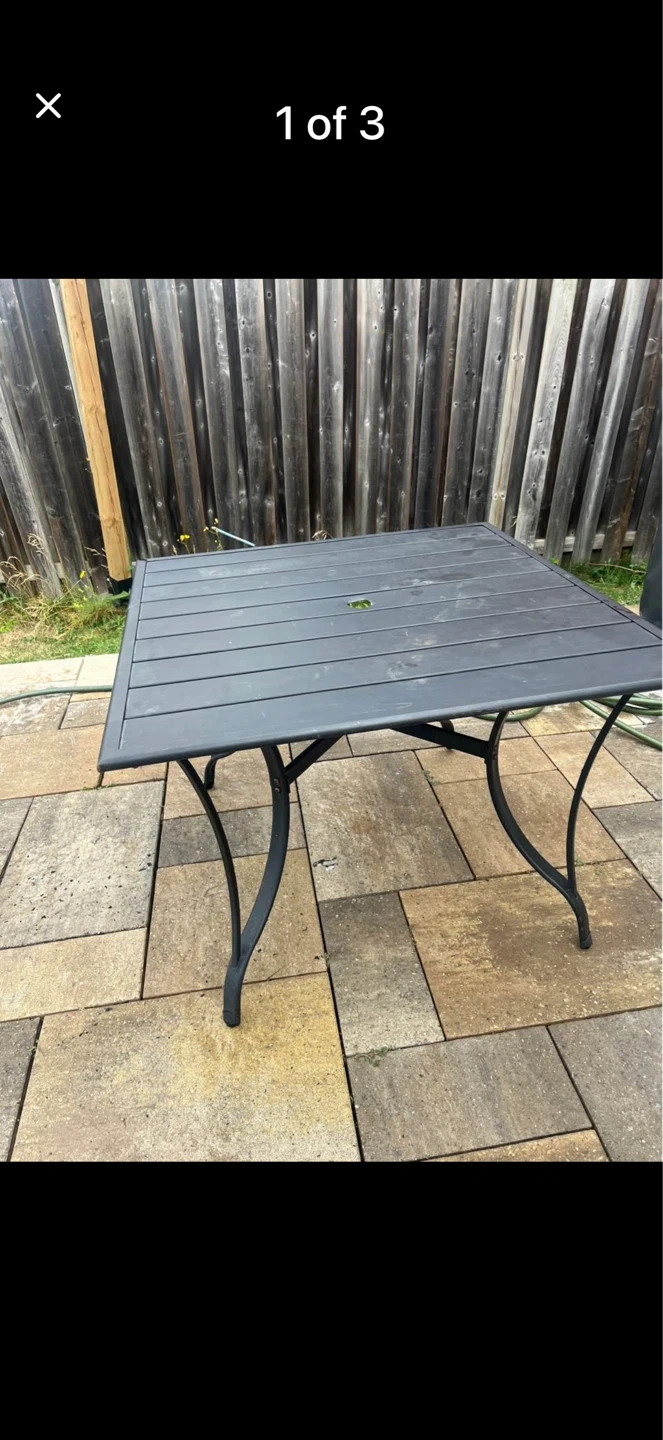 This is a dark grey square outdoor patio table. It has a slat top with a hole for an umbrella. The legs are made of metal. Great for enjoying meals outside!