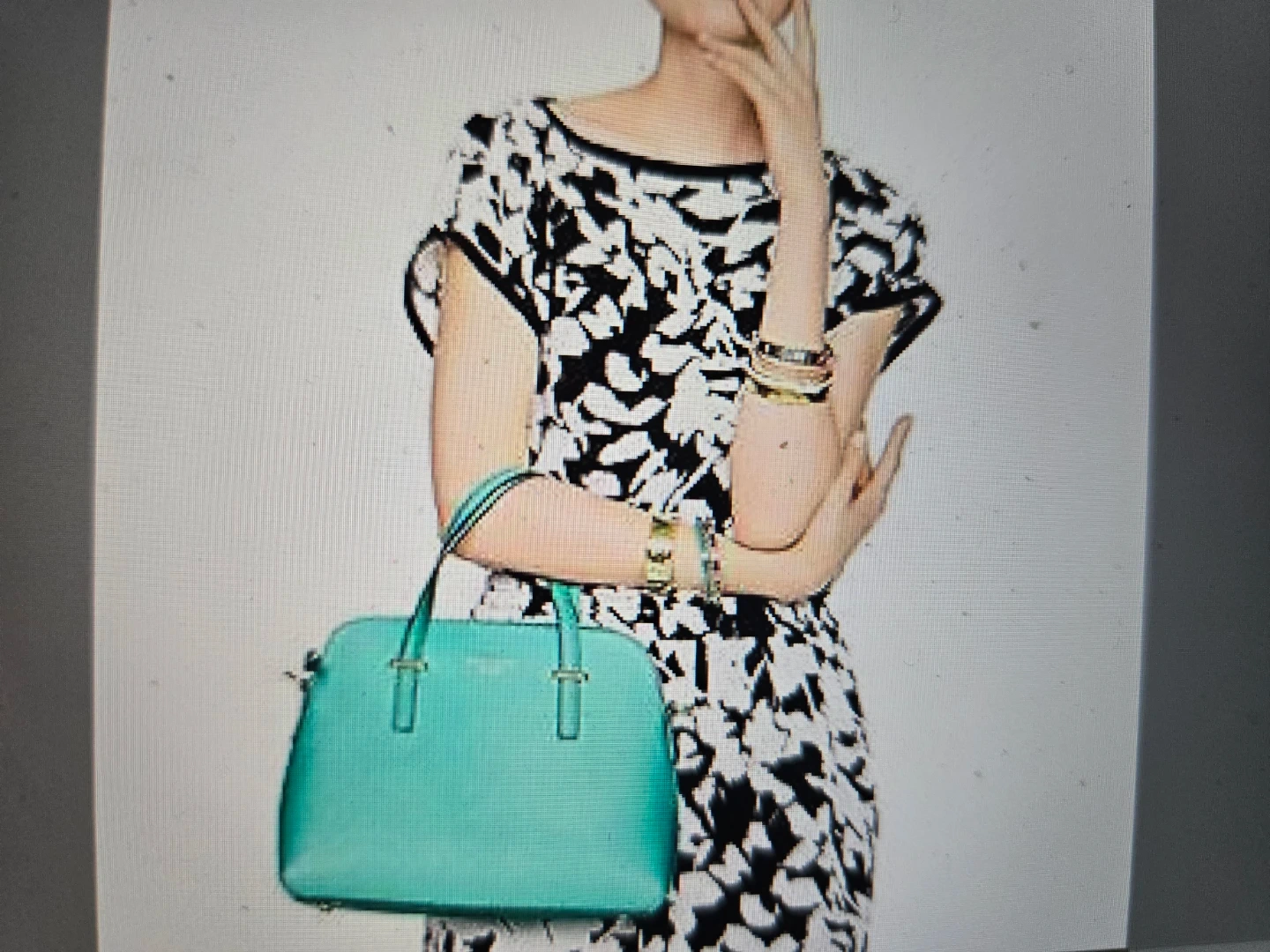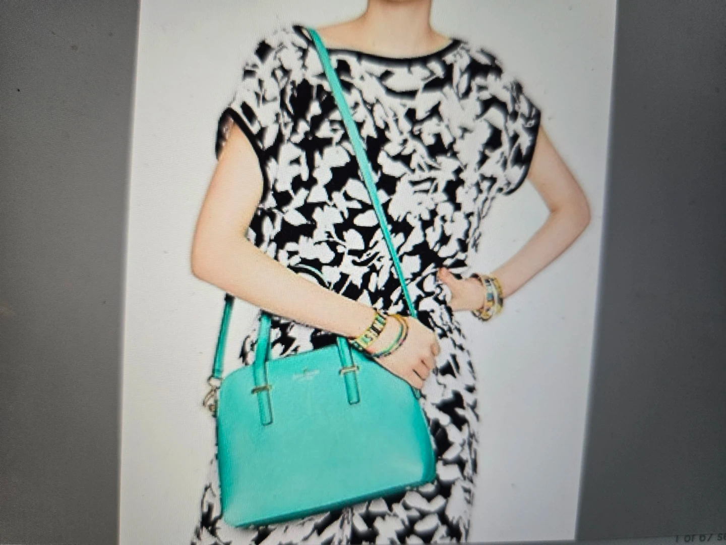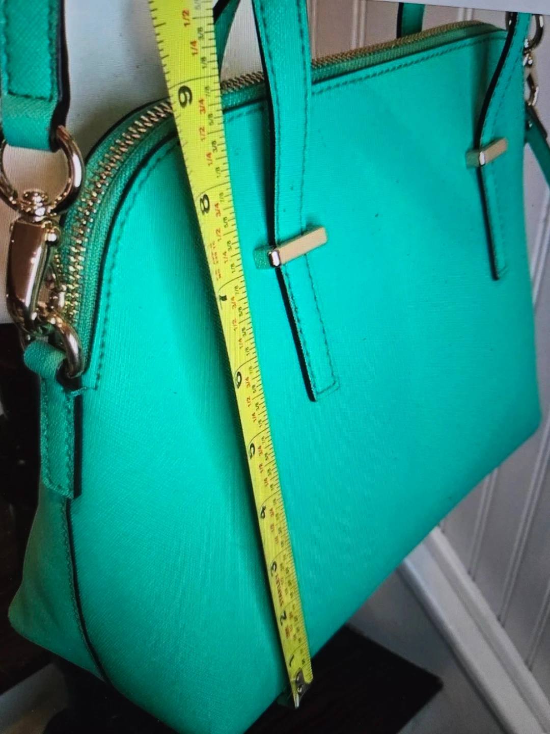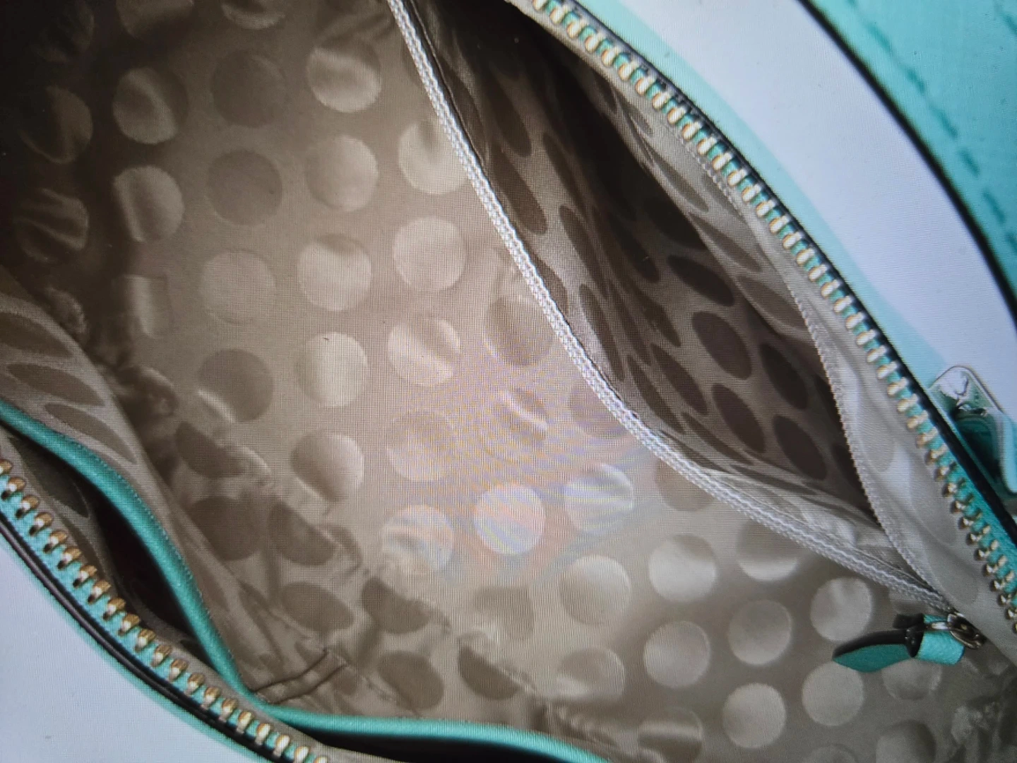 A lovely turquoise Kate Spade handbag. It features Saffiano (hatched) leather, gold plated hardware, and has top handles with a detachable crossbody strap. Includes a zippered top closure for security and a gorgeous champagne polka dot silky interior lining! Like new condition with some shaping needed from being in storage.
