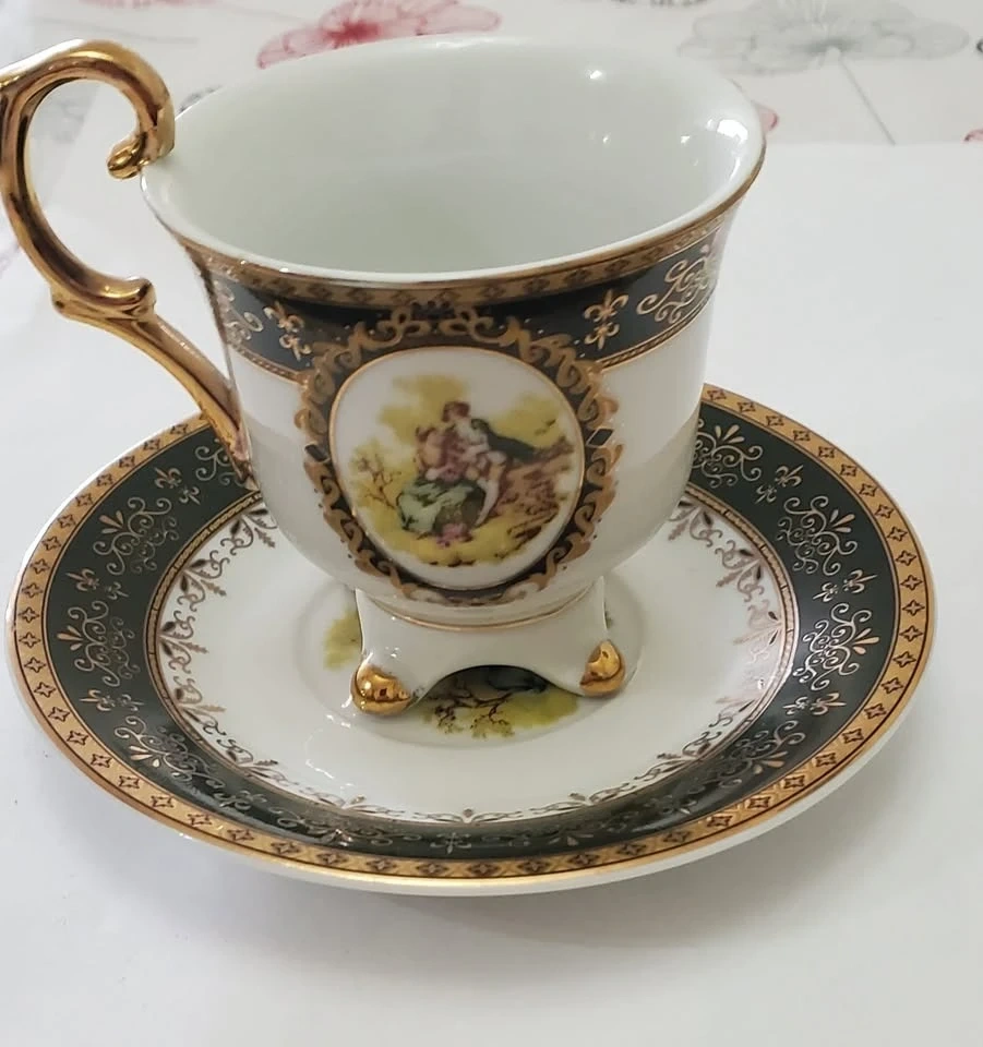 This Lordshade teacup and saucer set features a Dancy Italian Design. Each cup and saucer has a decorative gold trim and a charming scene. Includes five cups and five saucers.