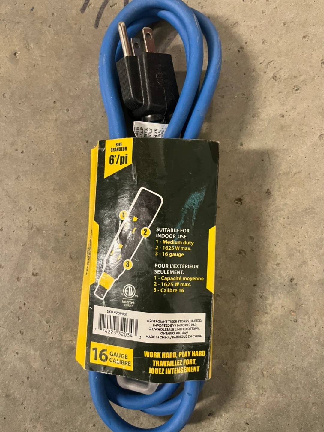 Tradesman Pro indoor/outdoor block heater cord. It's 6 feet long and 16 gauge. Suitable for up to 1625 W.