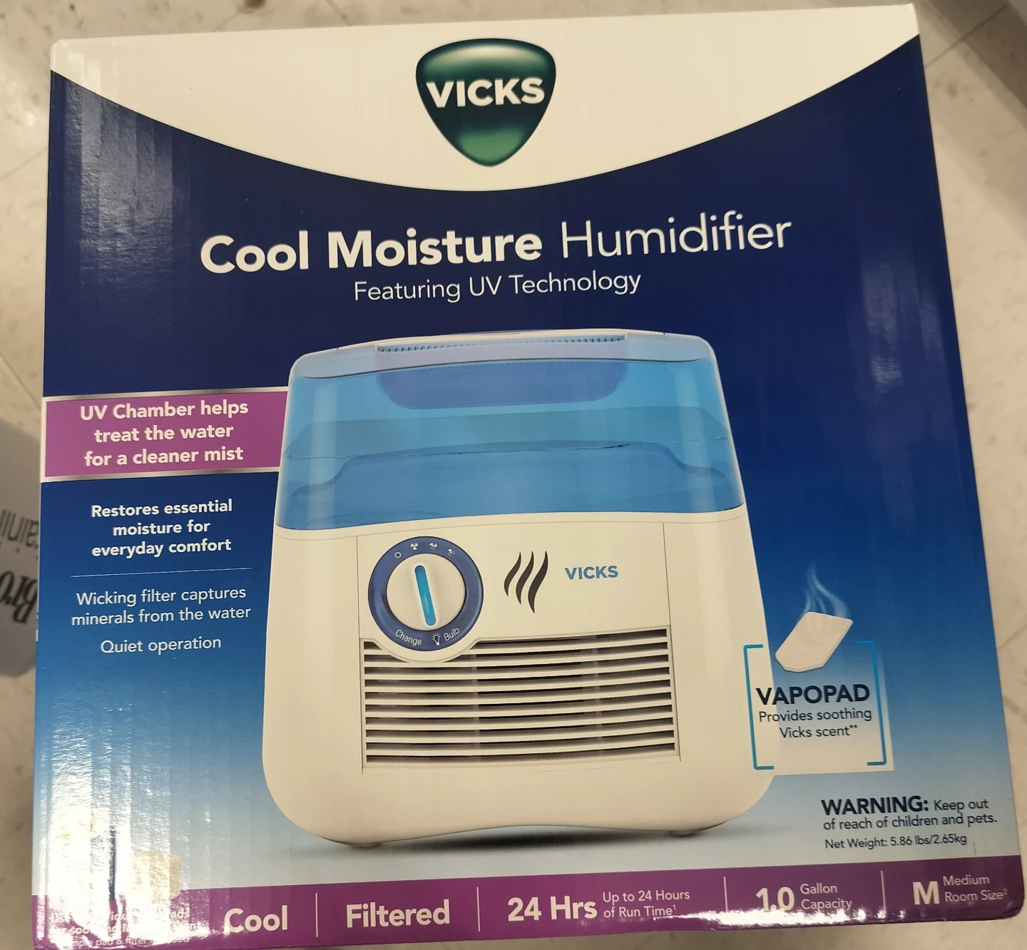 Vicks Cool Moisture Humidifier featuring UV technology for a cleaner mist. It restores essential moisture for everyday comfort with a wicking filter. This unit offers quiet operation and up to 24 hours of run time.