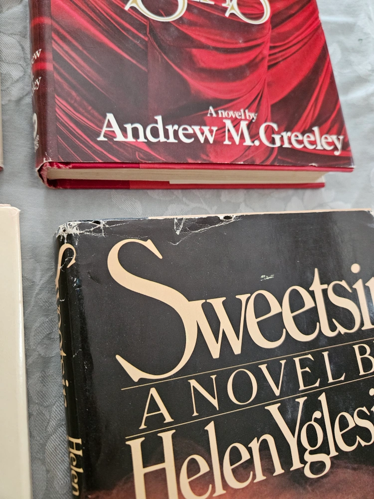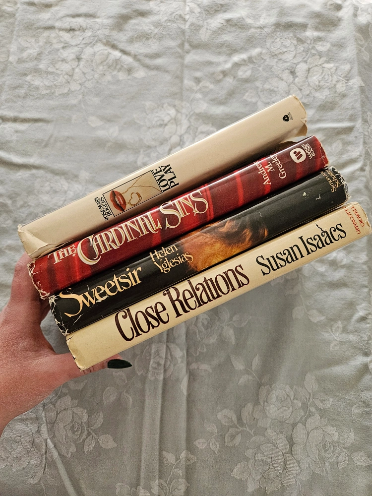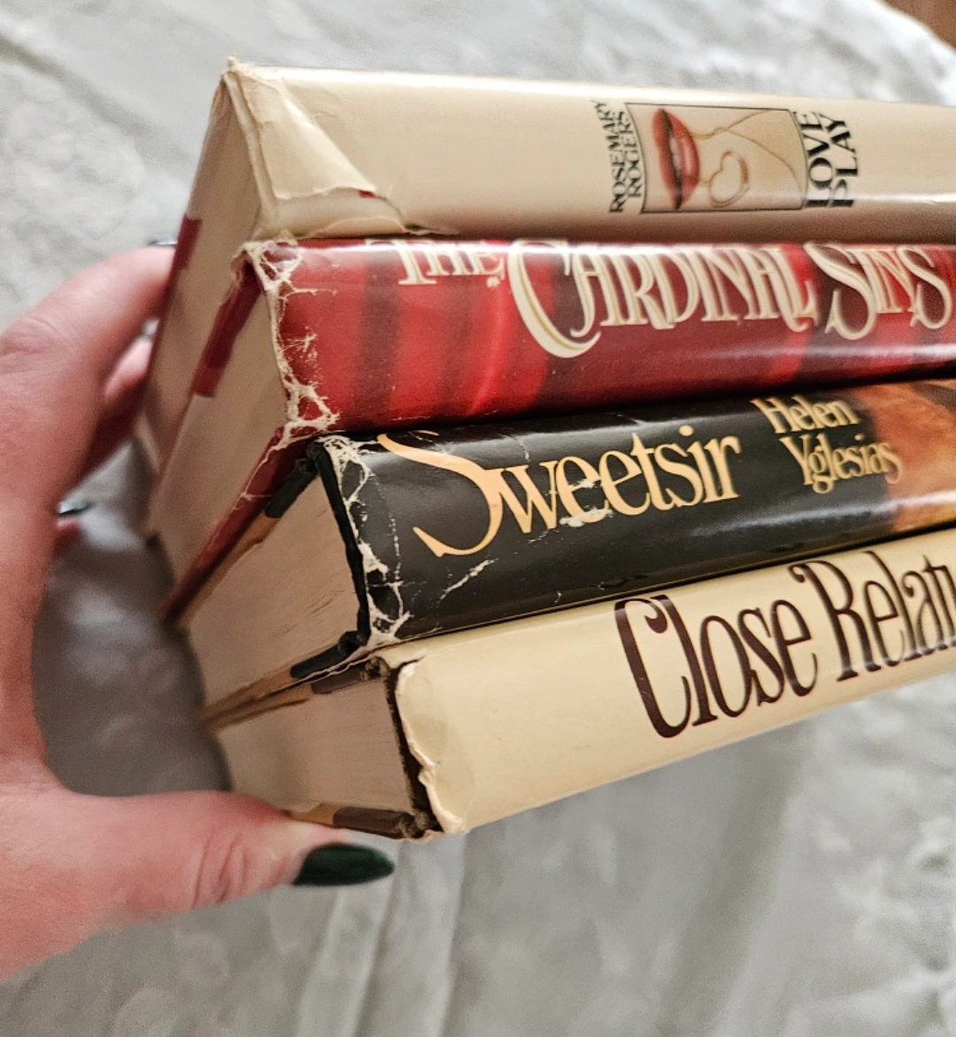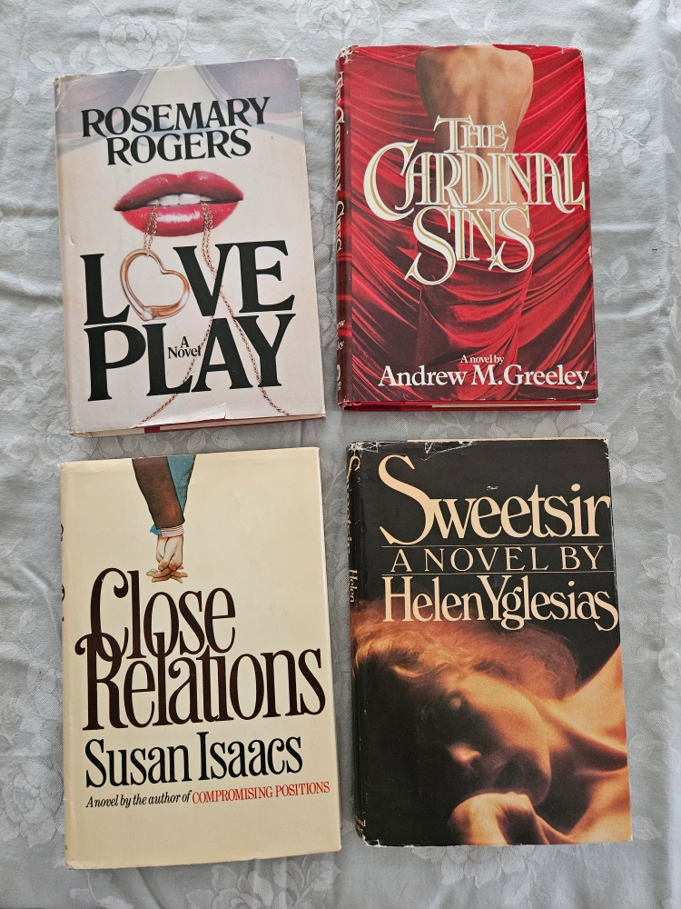 Four used hardcover novels. Titles include Love Play by Rosemary Rogers, The Cardinal Sins by Andrew M. Greeley, Close Relations by Susan Isaacs, and Sweetsir by Helen Iglesias. Dust covers show some wear, but the books are in good condition.