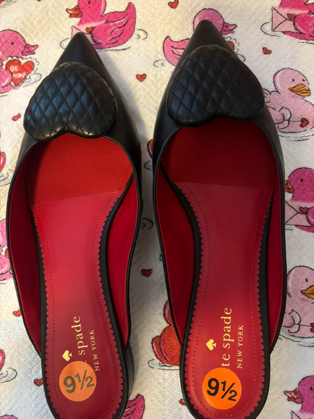 These stylish Kate Spade mules feature a black quilted heart detail on the vamp.