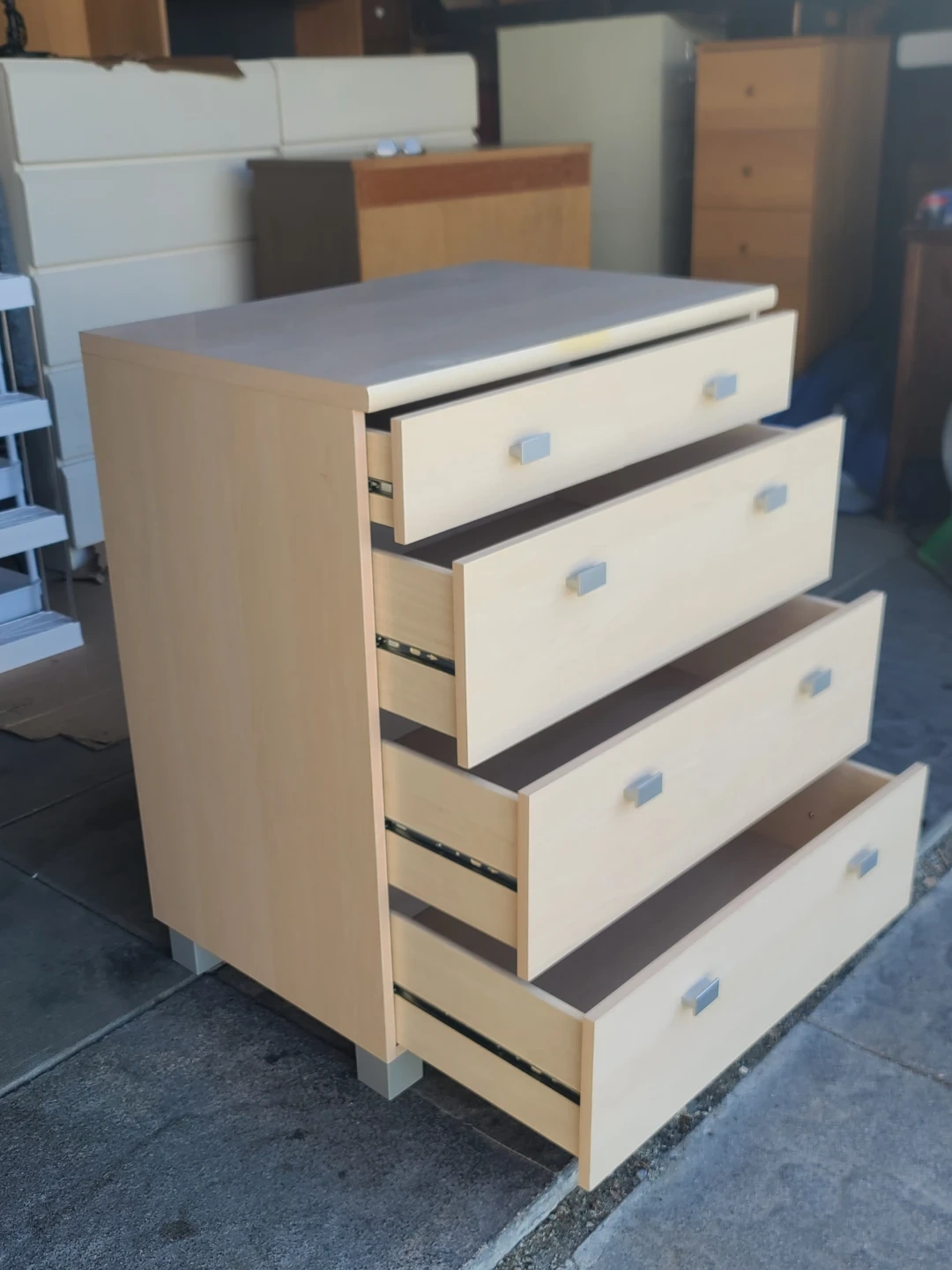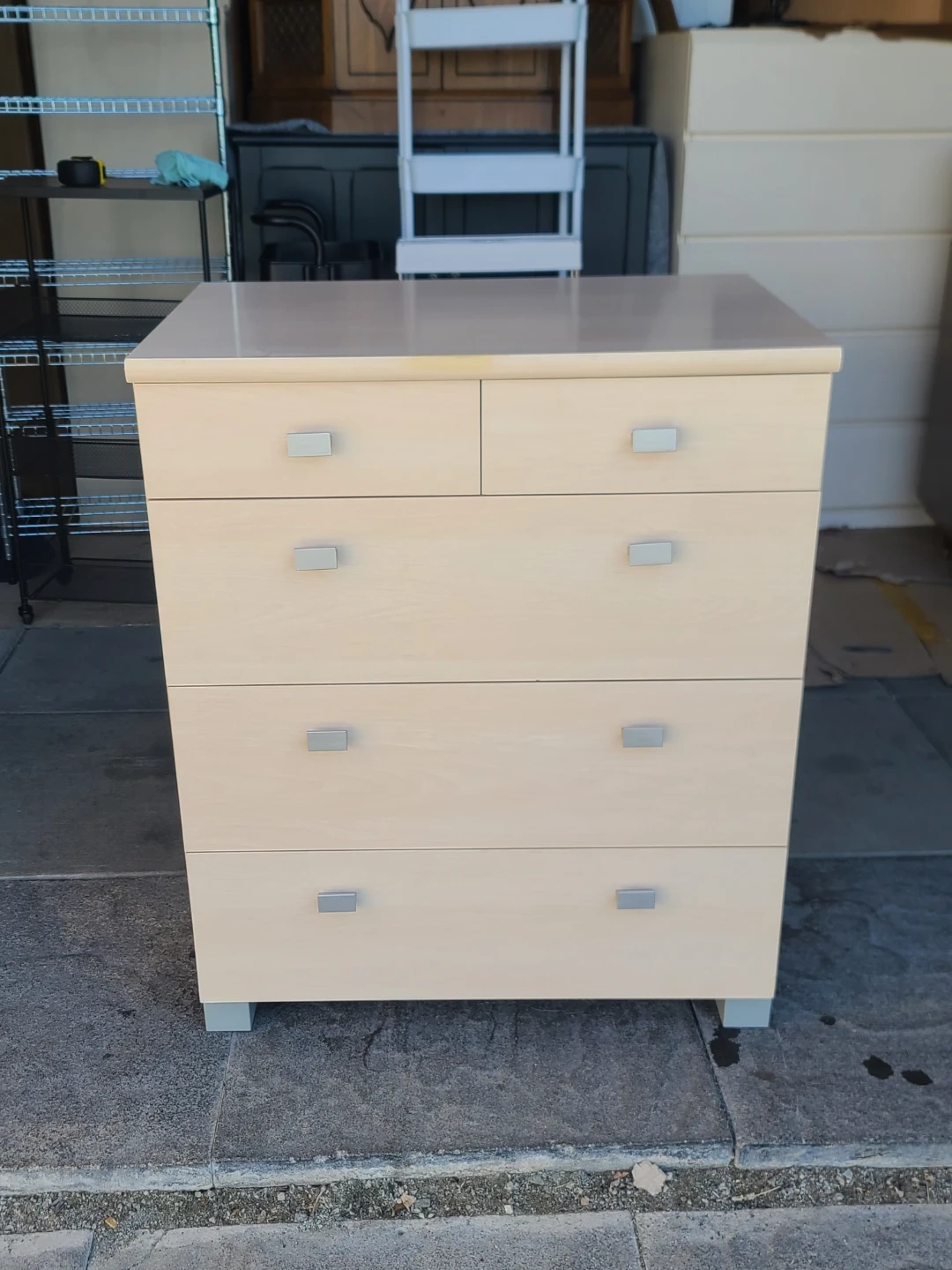 Spacious dresser. Has 5 drawers, two smaller ones on top and three larger ones below. Light wood finish with silver handles. Drawers have metal glides. Measurements: W 29" X 19 1/2" X H 35". Delivery can be arranged. Viewing and pickup by appointment.