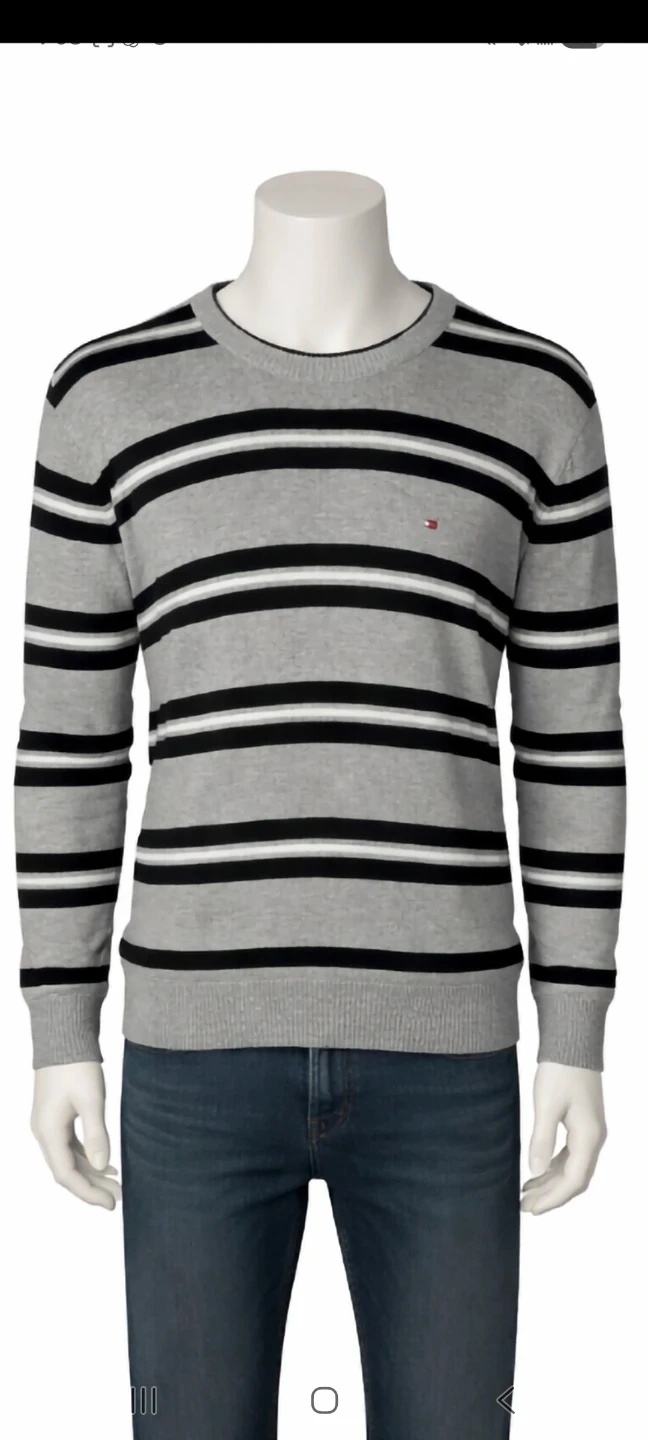 A long-sleeve knit Tommy Hilfiger sweater in light gray with horizontal navy and white stripes. It has a crew neckline and a small embroidered logo on the chest.
