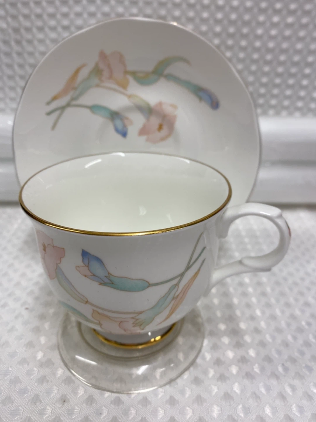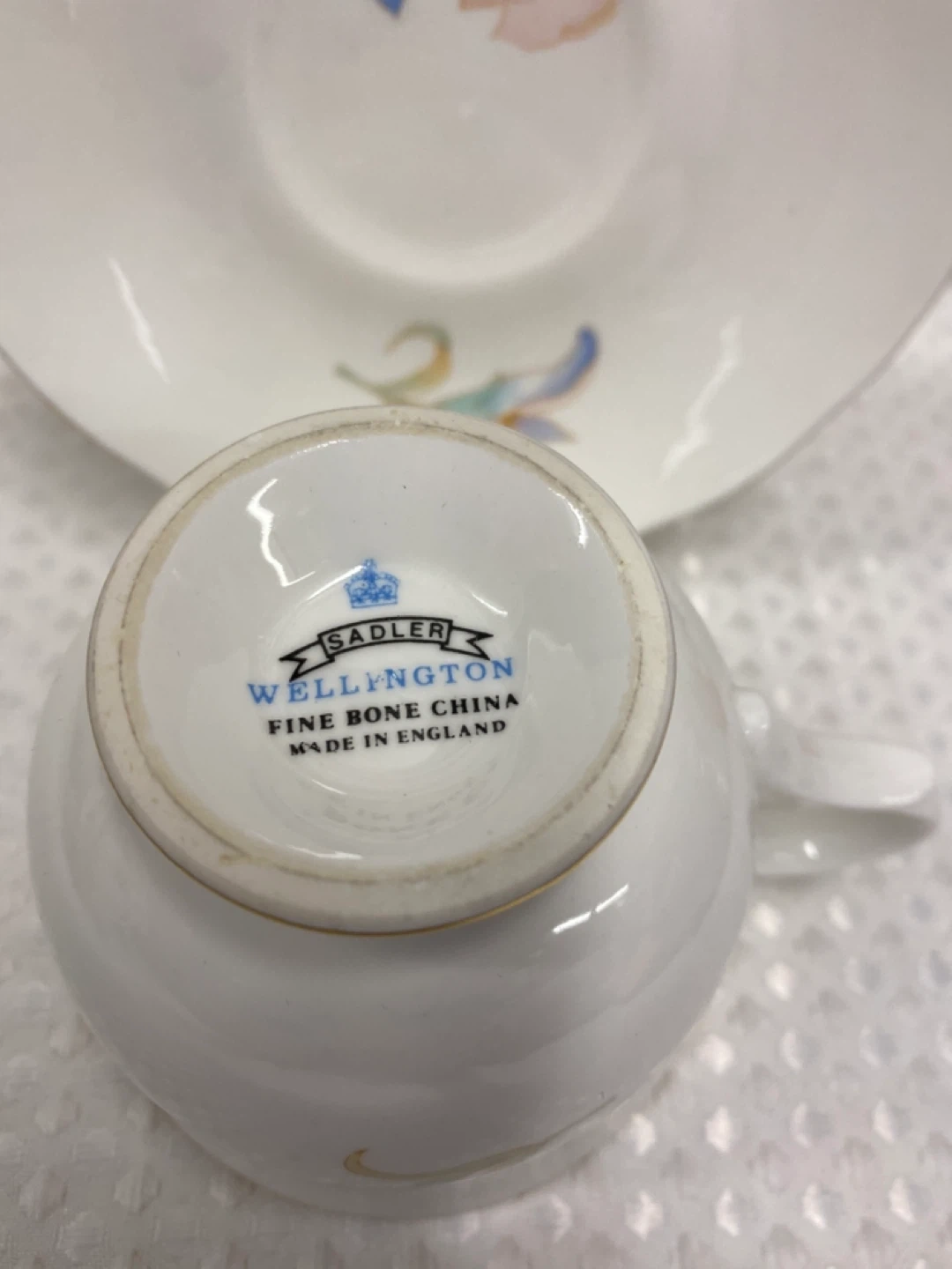 This Sadler Wellington teacup and saucer set is made of fine bone china. It's decorated with a delicate floral pattern. Made in England.