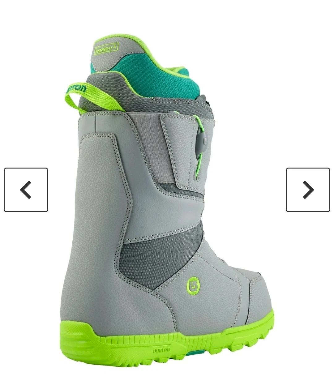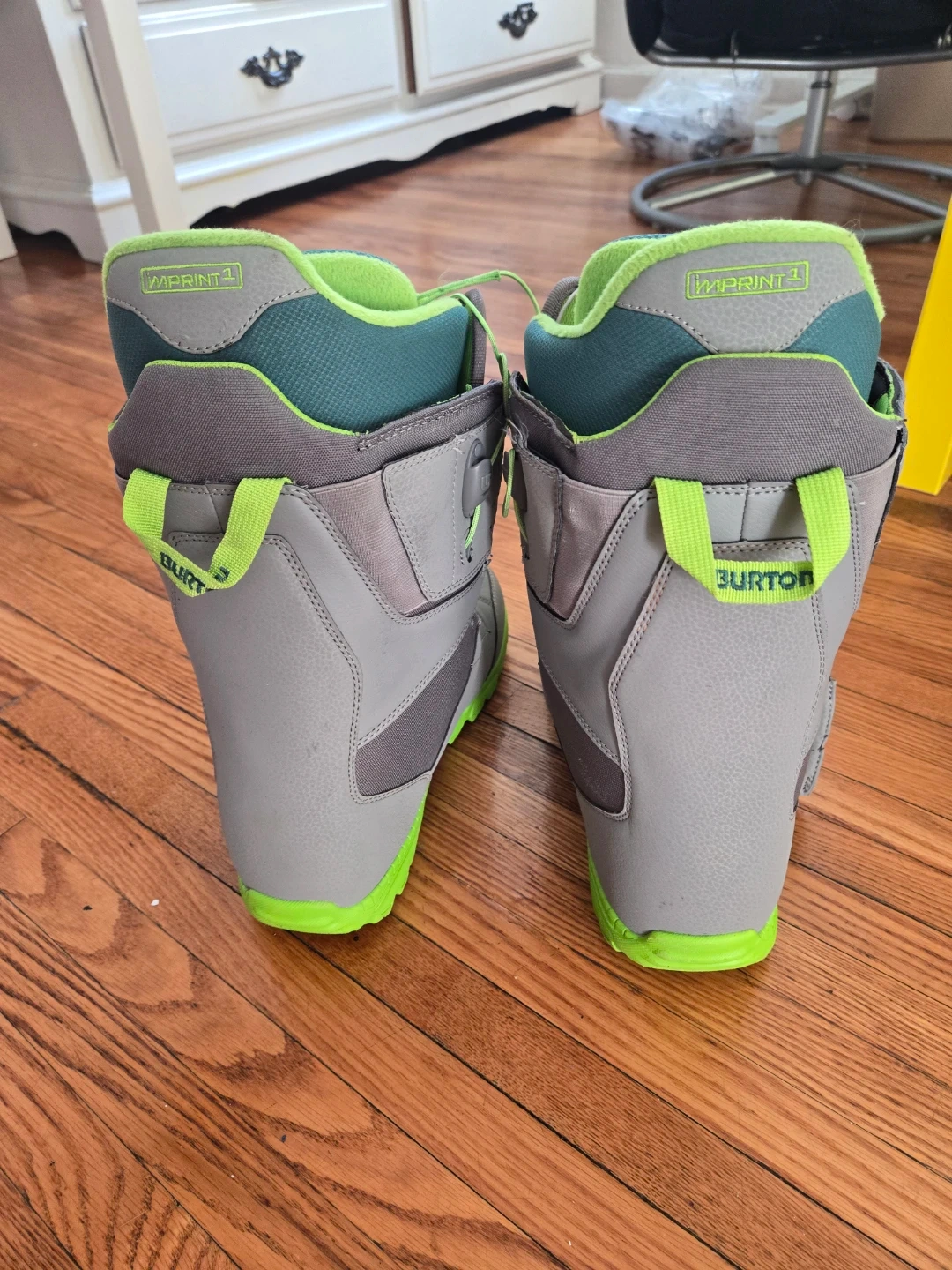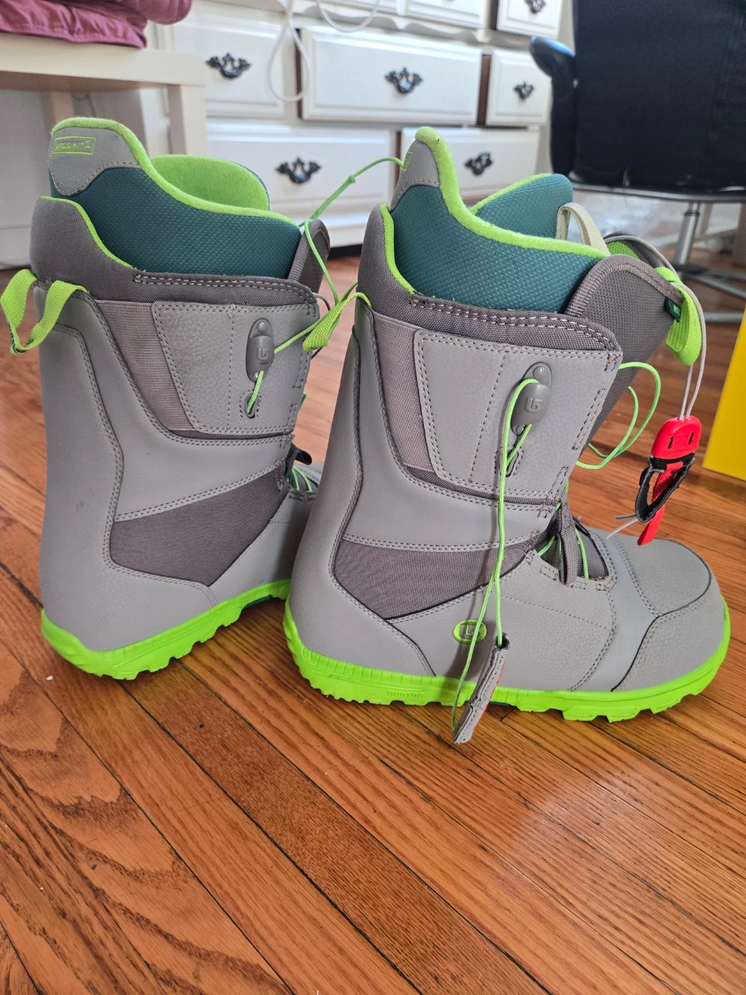 Burton Moto snowboard boots. Marked men's size 8.5 (will also fit womens 8-9 perfectly). Gray boots with neon green accents and feature a lacing system. They're designed for snowboarding comfort and performance.