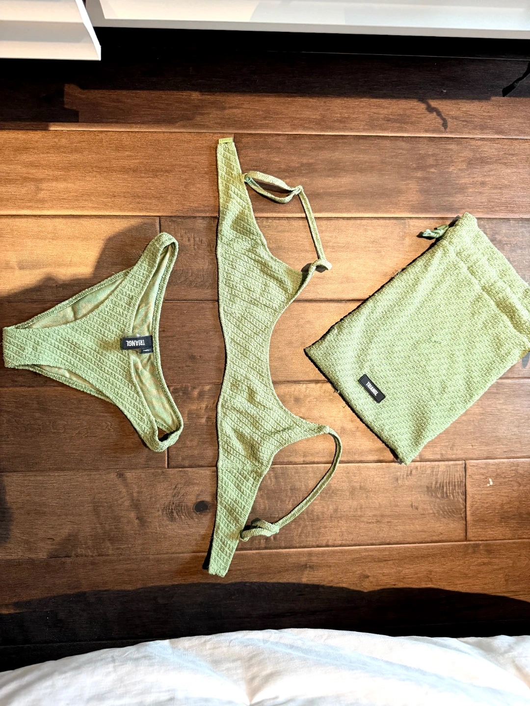 This is a TRIANGL bikini set. It includes a bikini top and bottom, along with a matching drawstring bag. The textured fabric is a light green colour. Only worn once to small
