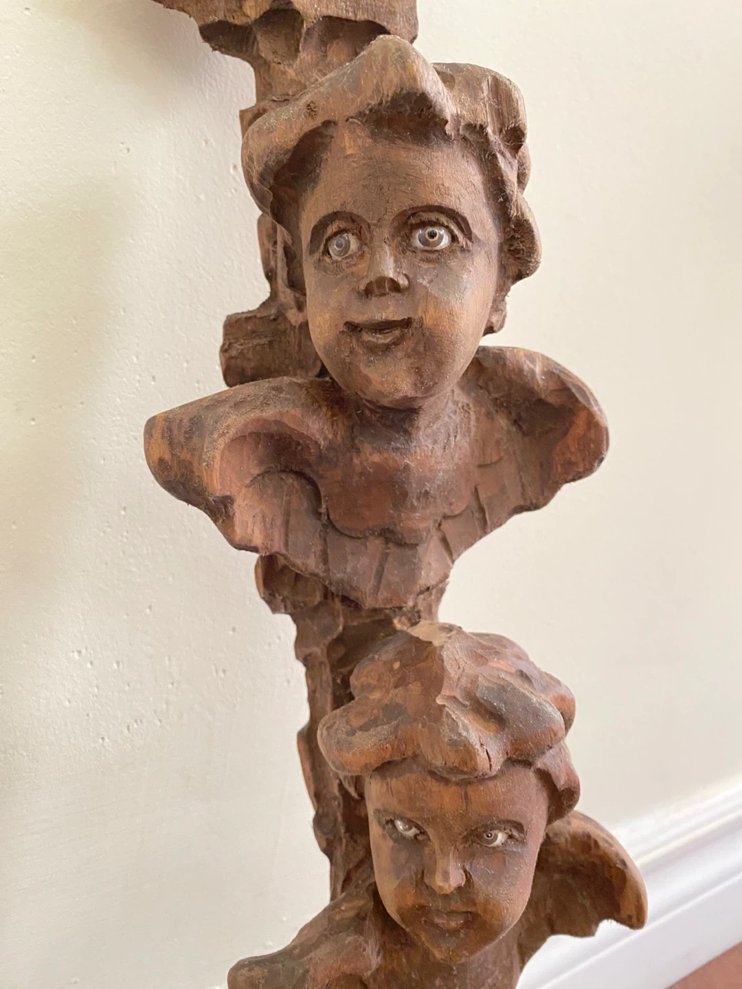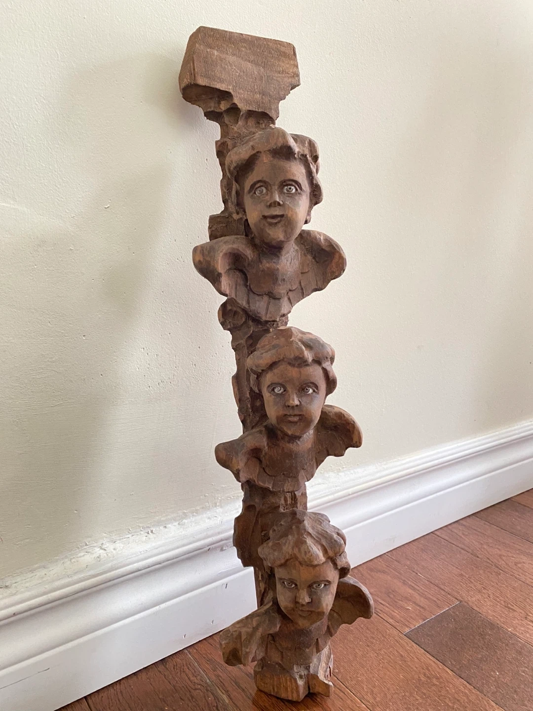 This antique wooden carving features three cherub faces stacked vertically. It's made of carved wood and measures approximately 18 inches in height. The piece has a hook on the back for hanging.