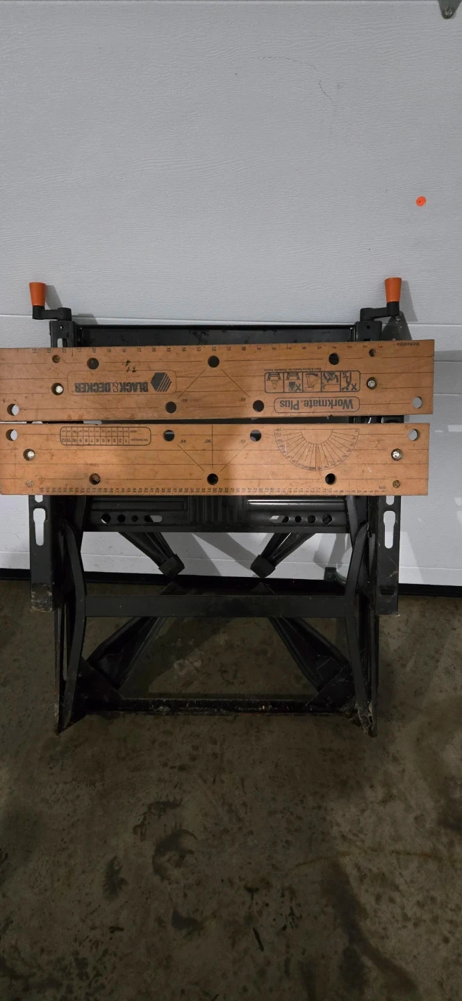 This is a BLACK+DECKER Workmate Plus portable workbench. It's a versatile tool for various projects. The workstation features a durable wooden top and a sturdy metal frame.