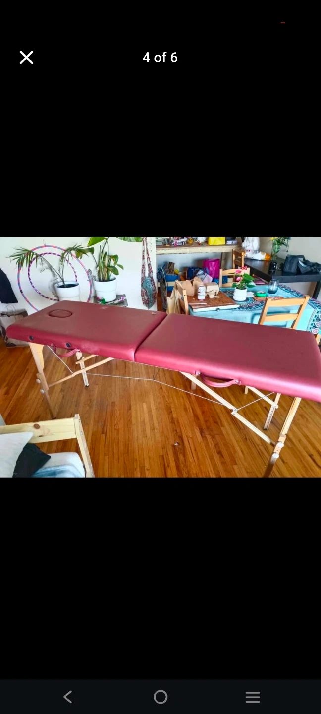 This is a portable massage table. It features a comfortable padded surface and a wooden frame. Includes a face cradle opening. Great for home or professional use!