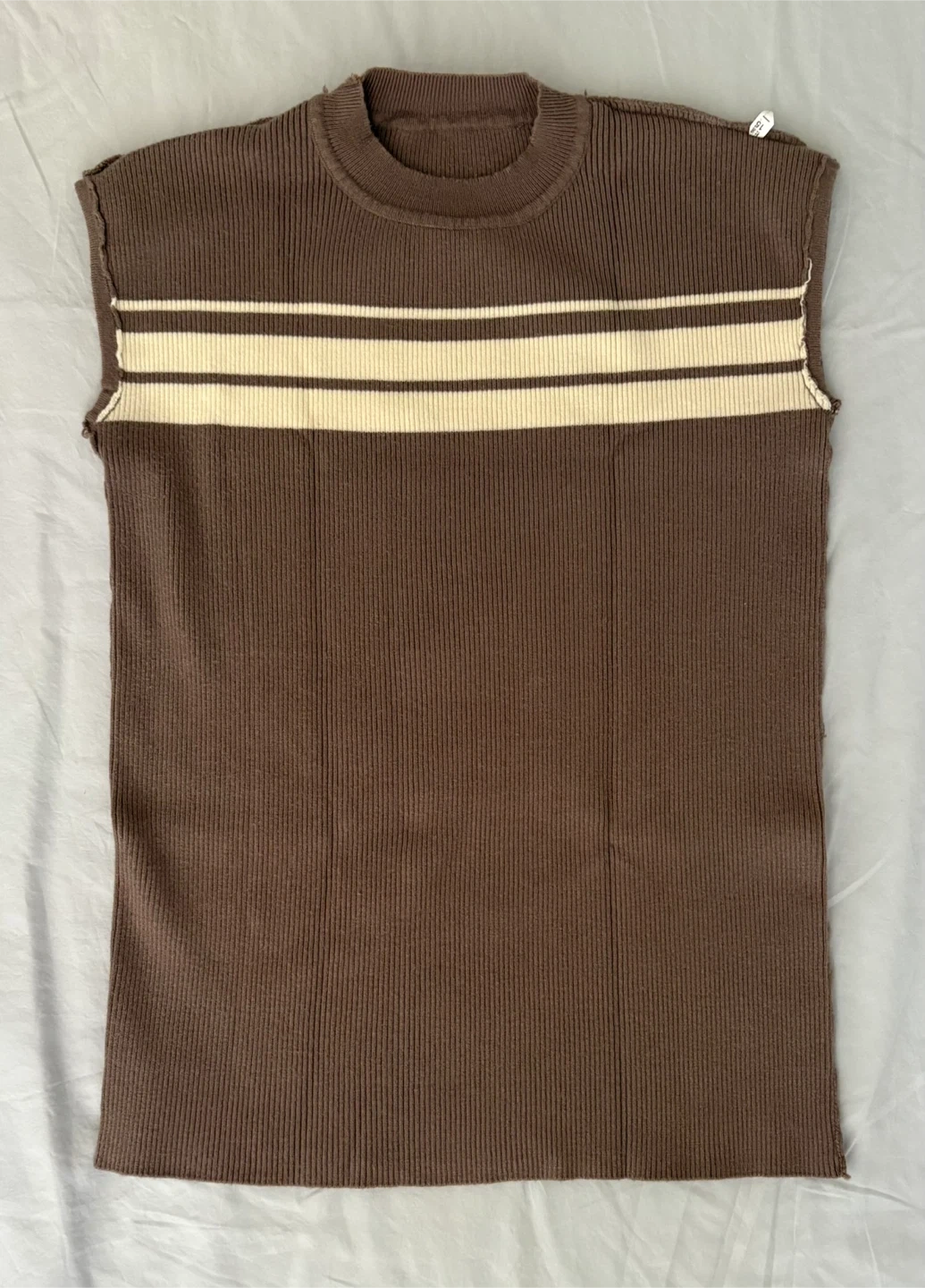 Cozy brown knit set! The sleeveless top has a chest measurement of 15 inches and a length of 23 inches. The pants have a waist that stretches from 22 to 40 inches and a length of 34 inches. Perfect for lounging or a casual day out