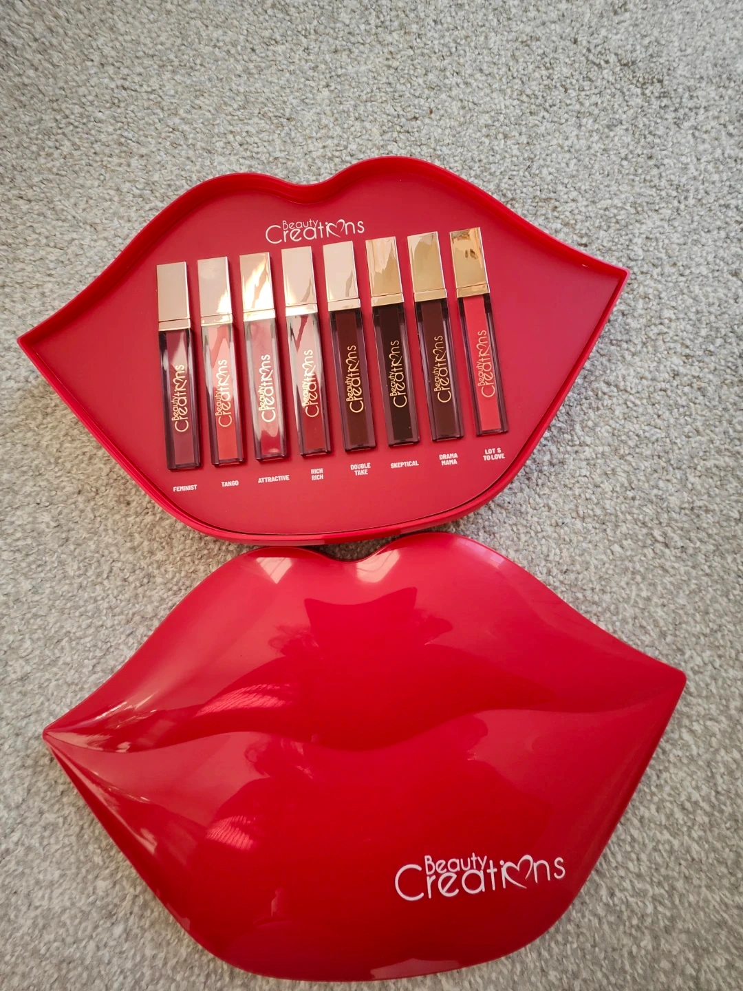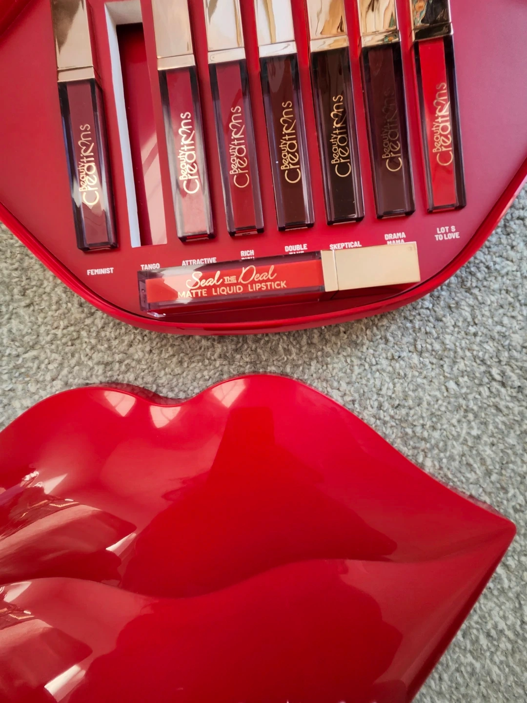 This is a Beauty Creations set of 7 matte liquid lipsticks. It includes shades named Feminist, Tango, Attractive, Rich, Double Rich, Skeptical, Drama Mama, and Lot's To Love. These are liquid lipsticks with a matte finish. Great for trying out different shades!