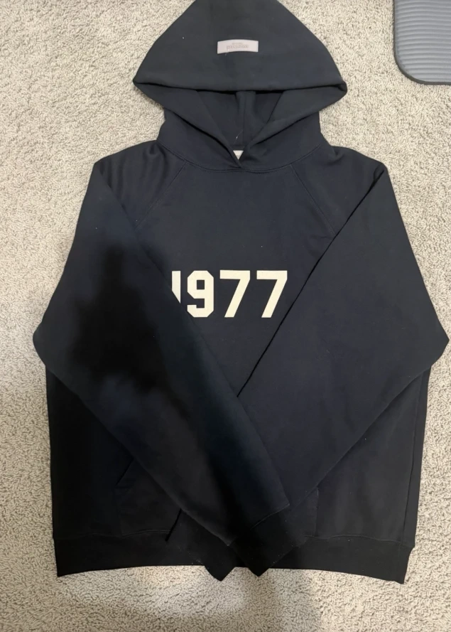 Essentials Fear of God black hoodie with "1977" graphic on the front. It's a comfortable pullover style with a front kangaroo pocket. Cotton blend material.
