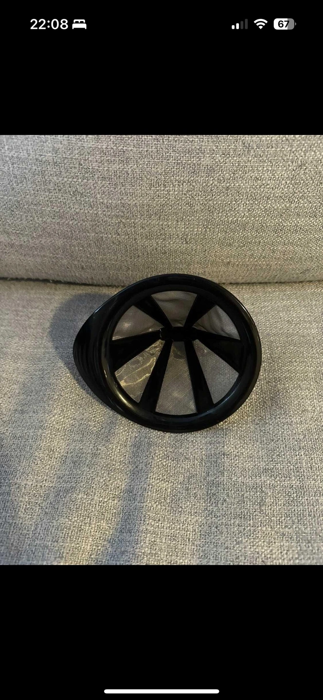 This glass coffee maker has a black silicone band and cork base. It comes with a mesh filter.