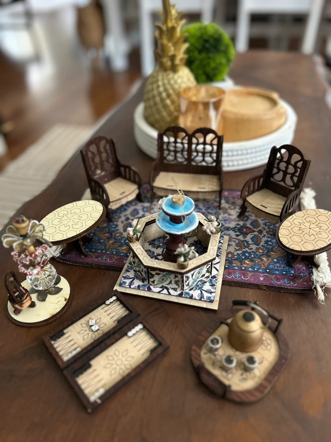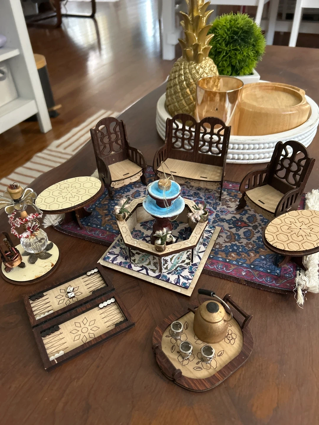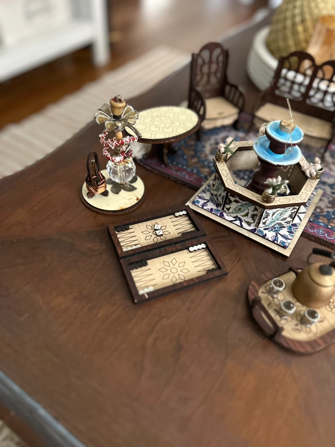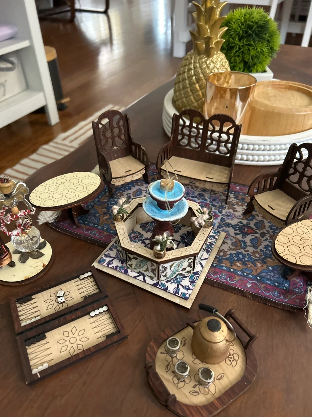 This miniature set includes a fountain, chairs, tables, a backgammon game, and a tea set. The pieces are crafted from wood and appear to be for a dollhouse or diorama. The detail on the furniture and accessories is quite charming! It's a lovely collection for any miniature enthusiast.