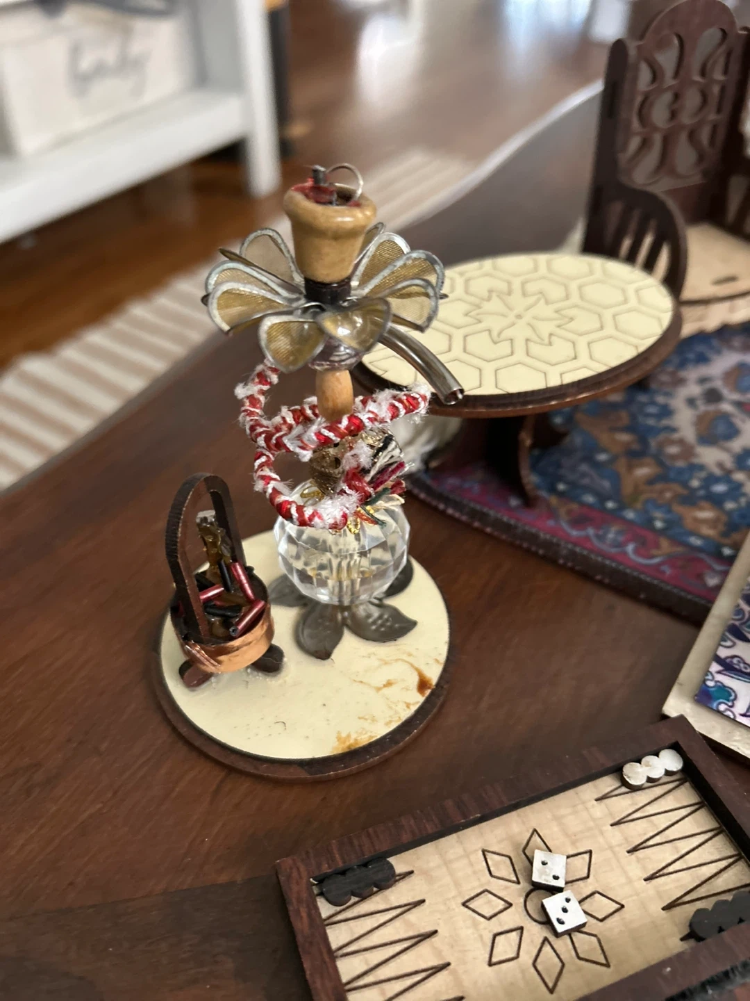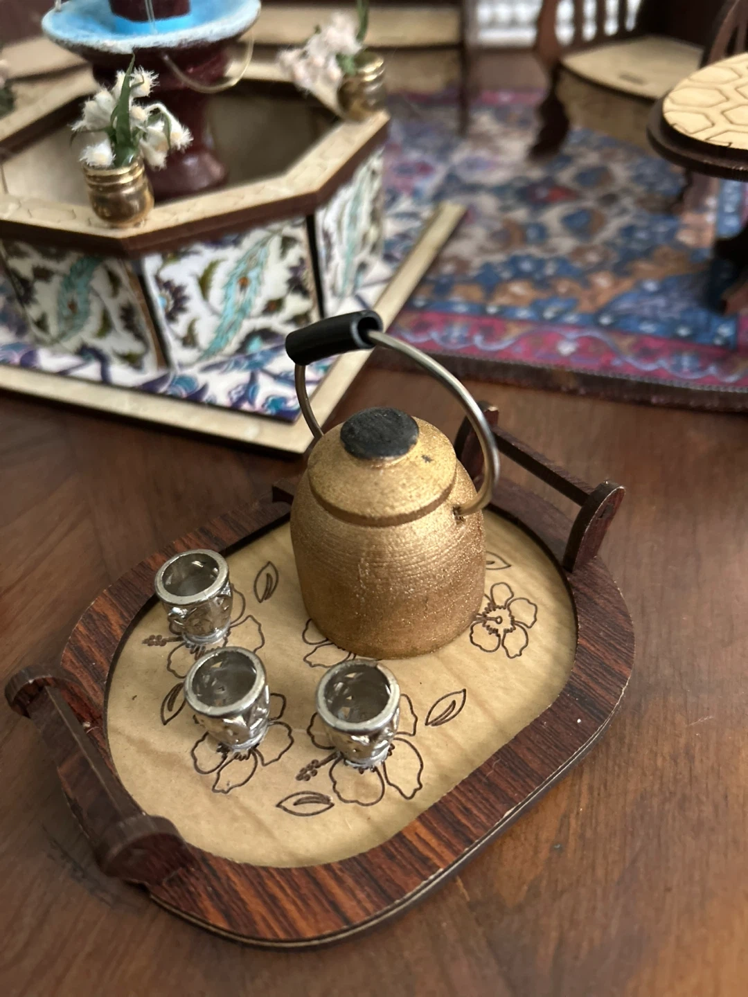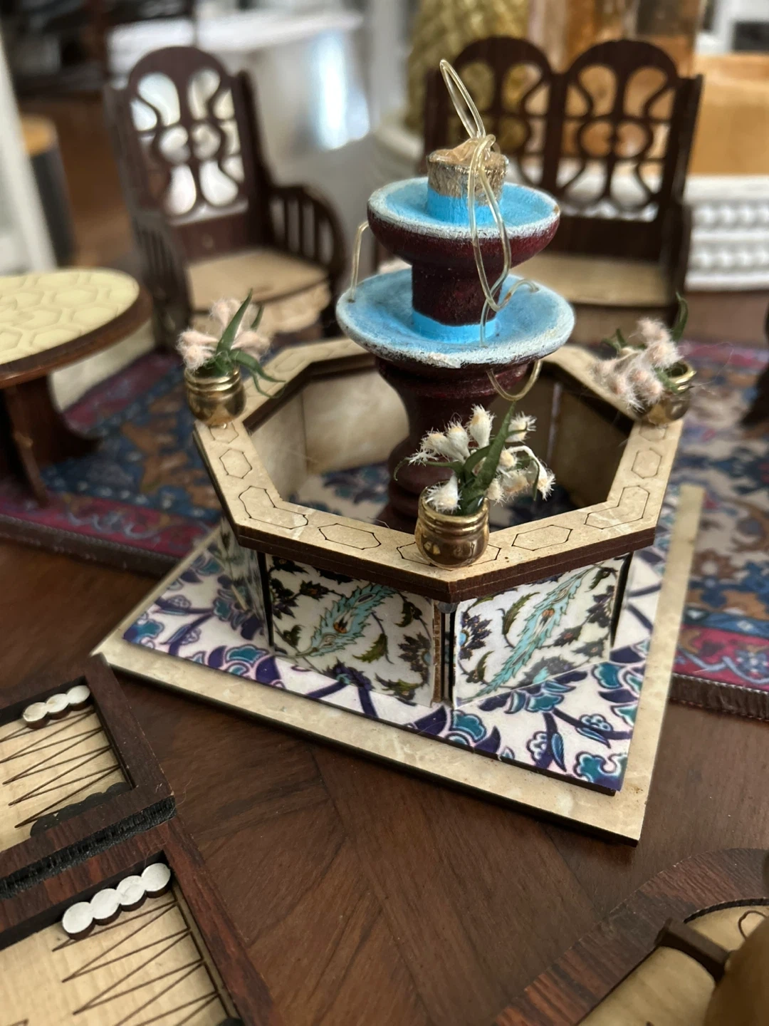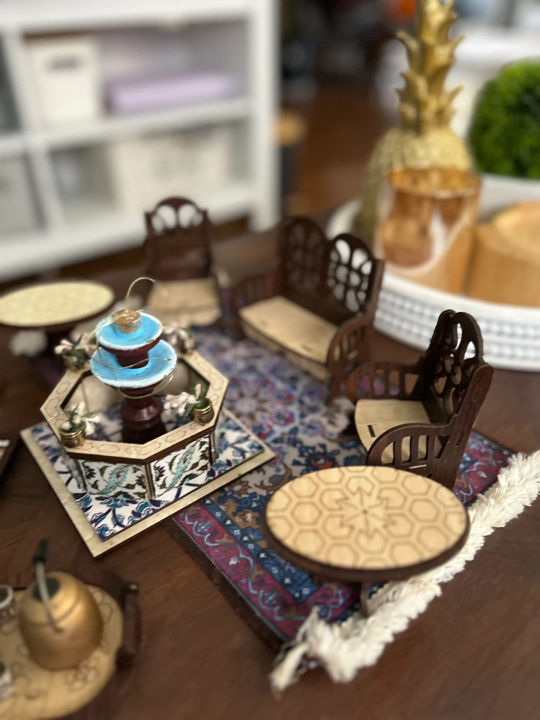 This miniature set includes a fountain, chairs, tables, a backgammon game, and a tea set. The pieces are crafted from wood and appear to be for a dollhouse or diorama. The detail on the furniture and accessories is quite charming! It's a lovely collection for any miniature enthusiast.