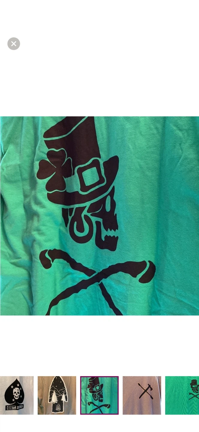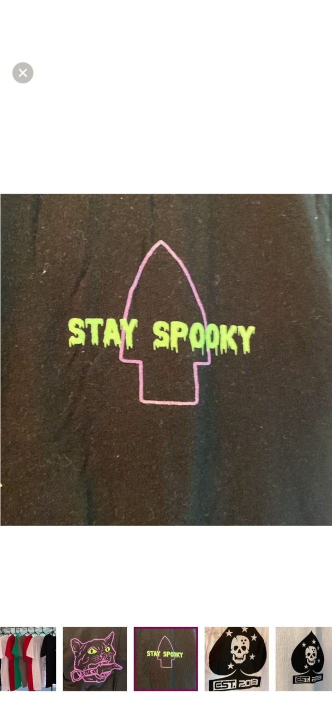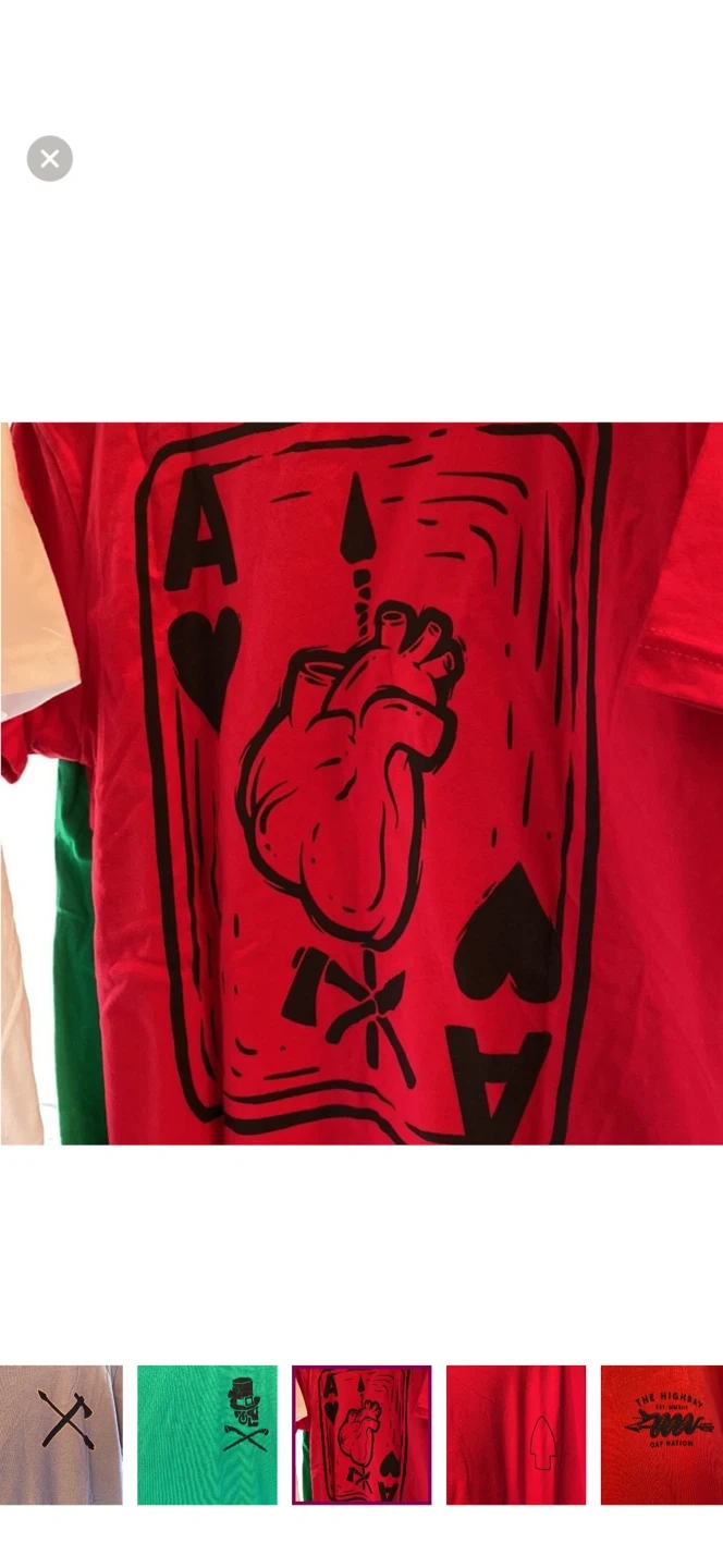 Assorted graphic t-shirts featuring unique designs. Includes a pink cat with a knife, a skeleton with a hat, and an ace of hearts with a heart. Made from 100% cotton. Sz S NWOT. Unigender. Teens. Black, white, green and red available.