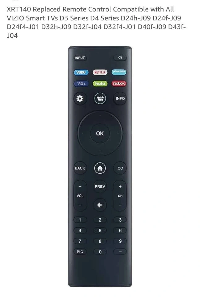 This is a replacement remote control compatible with many VIZIO Smart TV models, including the D3, D4, D24h-J09, D24f-J09, D24f4-J01, D32h-J09, D32f-J04, D32f4-J01, D40f-J09, and D43f-J04 series. Feel free to message if you have any questions!
