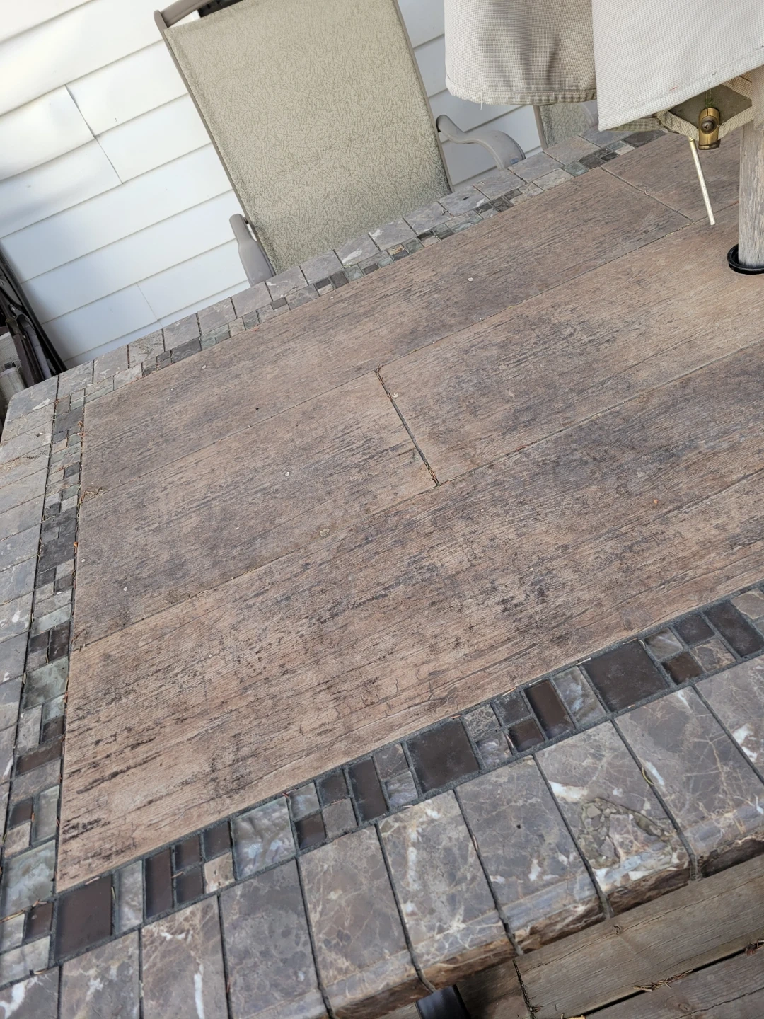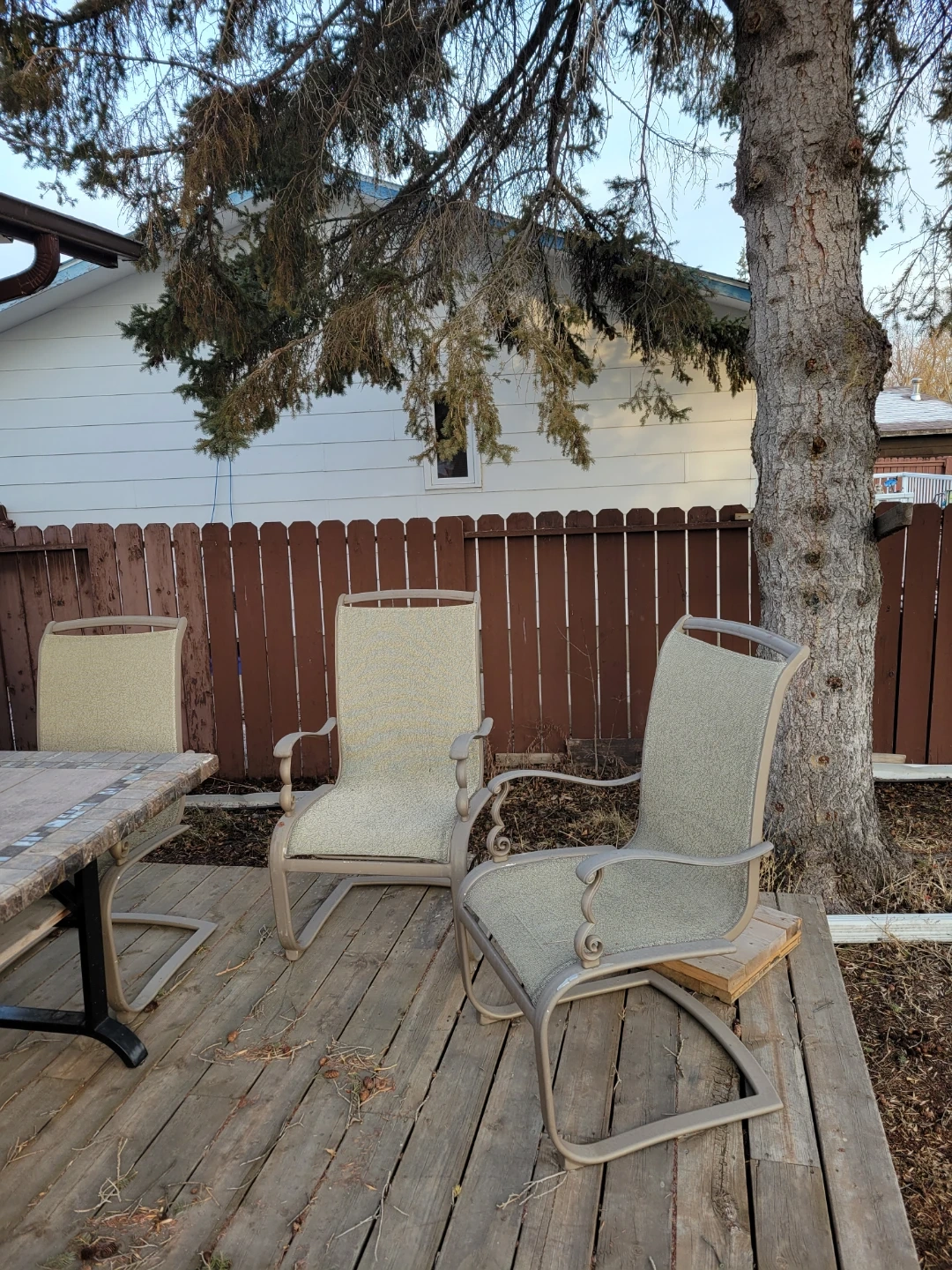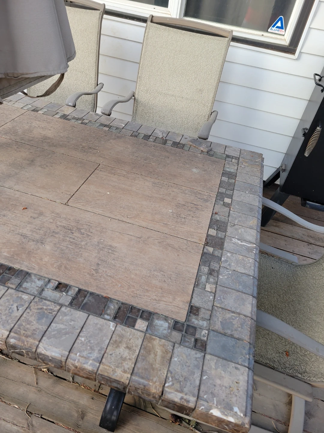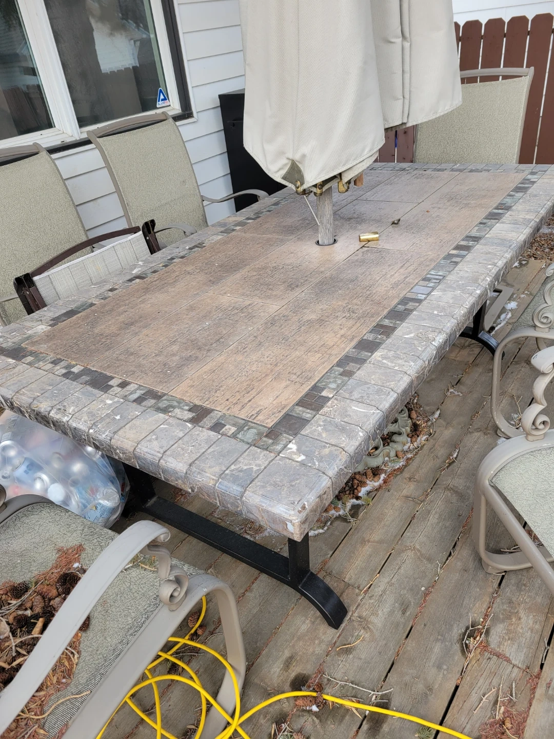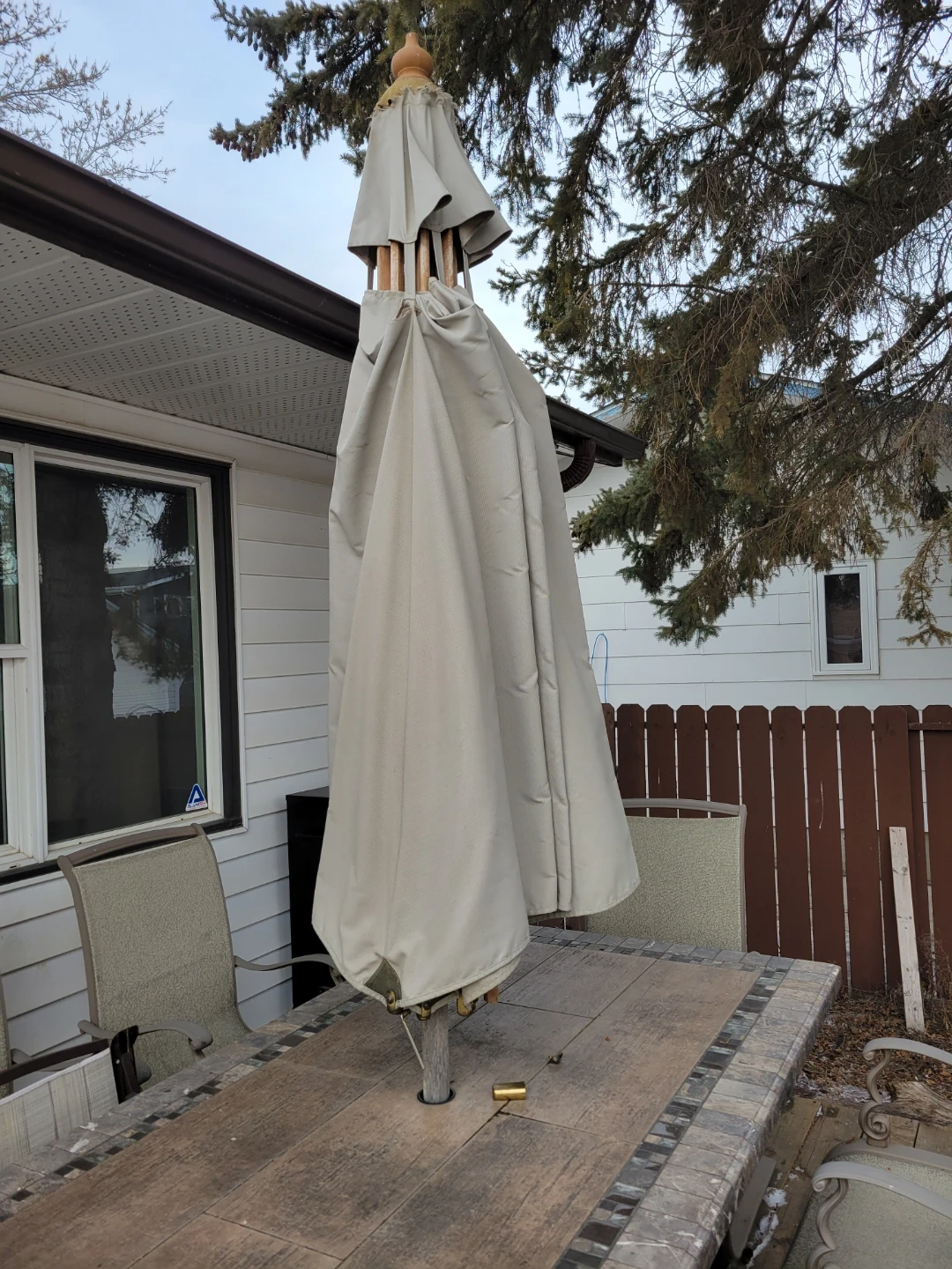A light tan coloured cover for a patio umbrella. It's made of a durable material to protect your umbrella from the elements. It's designed to fit most standard patio umbrellas. Stone table, 6 identical chairs and an umbrella 500.00