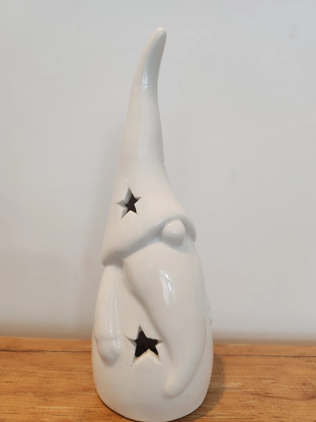 A cute white ceramic gnome lantern with star cutouts. It's perfect for adding a cozy glow to any room. Ceramic material. Batteries included.